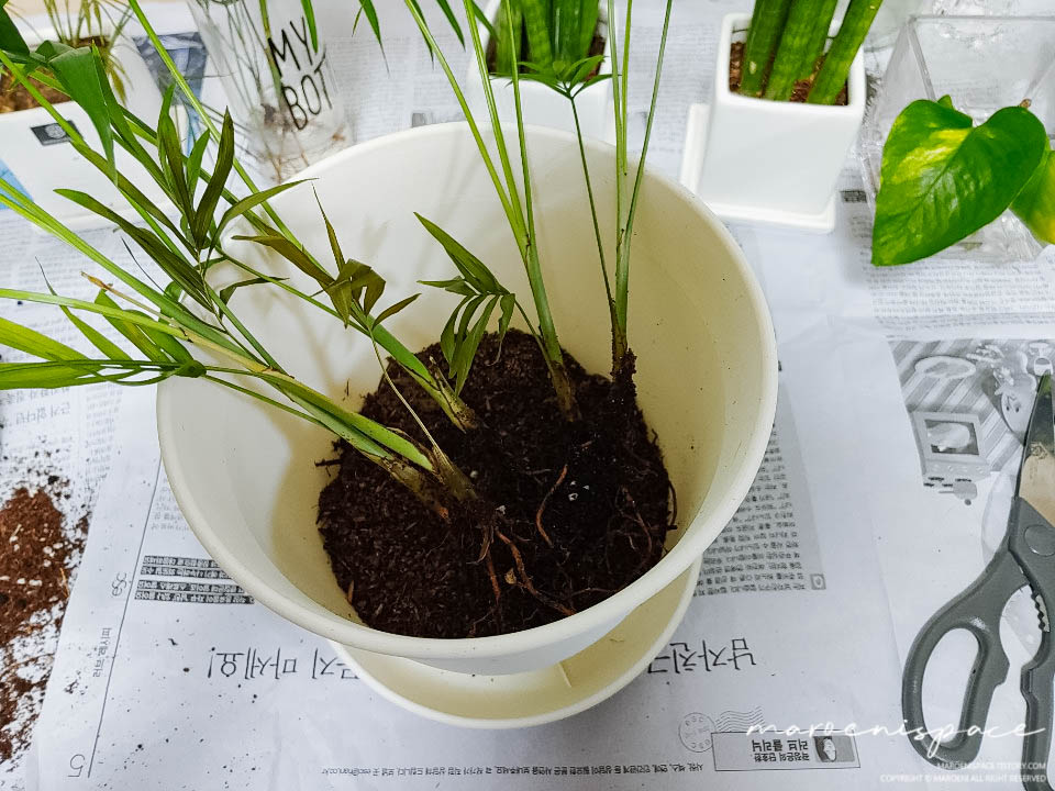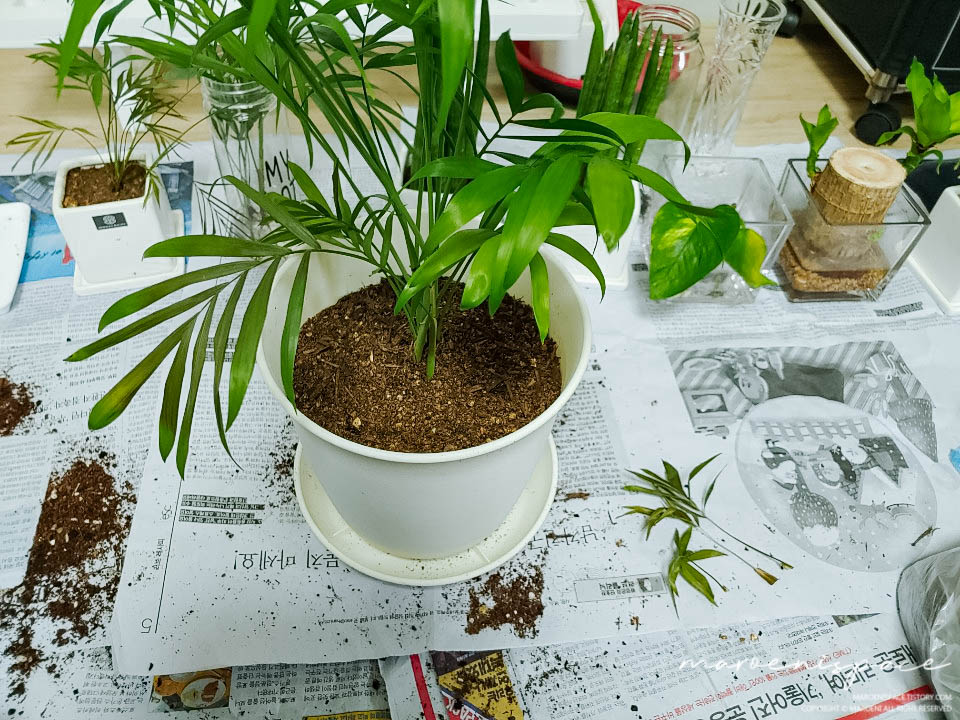 이제 테이블 야자의 멱살을 잡고 봉지에 들은 흙을 살살 뿌려주면! 간편하게 분갈이가 끝납니다.