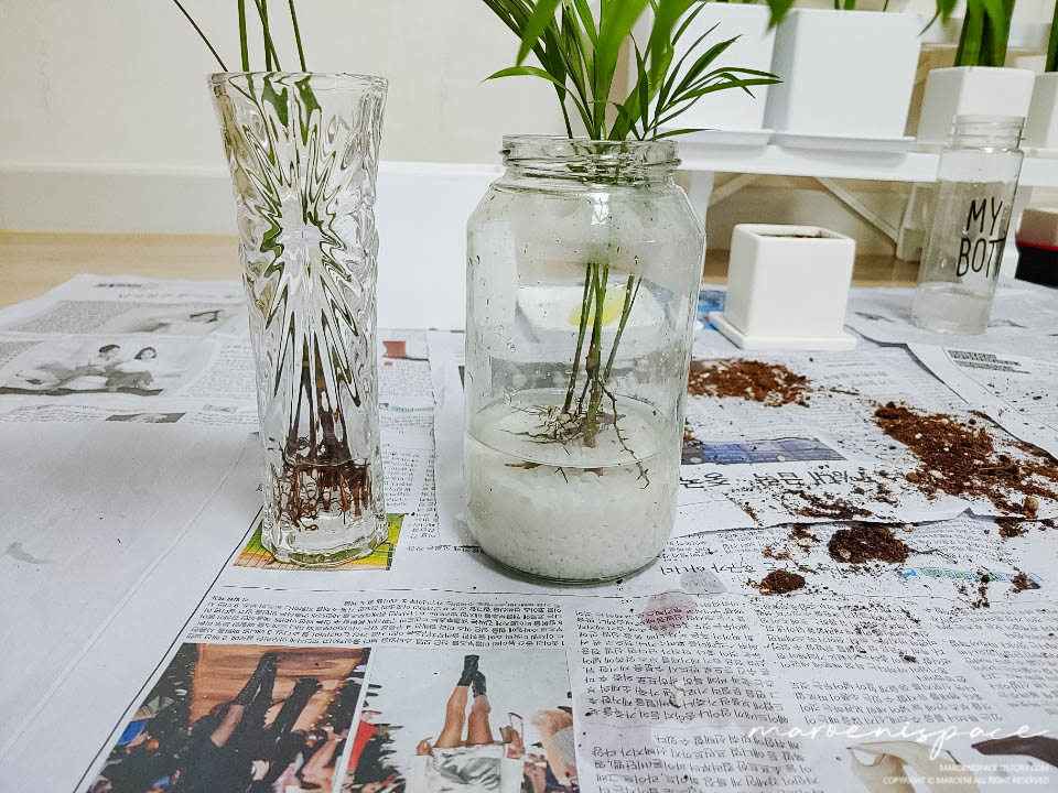 병을 깨끗하게 소독하고, 아래에 자갈을 살짝 깔아준 다음 테이블 야자를 넣어주었어요. 그리고 물을 살짝 채워보니 이제야 뭔가 인터넷으로 판매하는 수경재배 테이블 야자 같은 느낌이 나네요.
