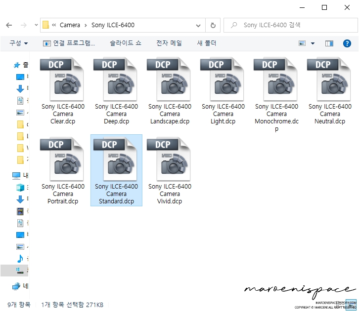 위의 경로에서 본인의 카메라 모델명을 찾고 폴더 안에 들어가서 여러가지 프로파일 중에서 Standard.dcp를 복사해주세요.