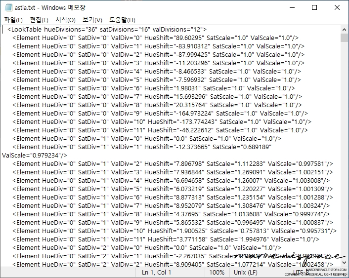 디컴파일된 xml파일을 열어보면 마찬가지로 엄청 긴 코드들이 나오는데, 여기서 LookTable부터 /ToneCurve까지 부분을 지우신 후 메모장에 있는 내용을 고~대로 붙여넣어 주시고