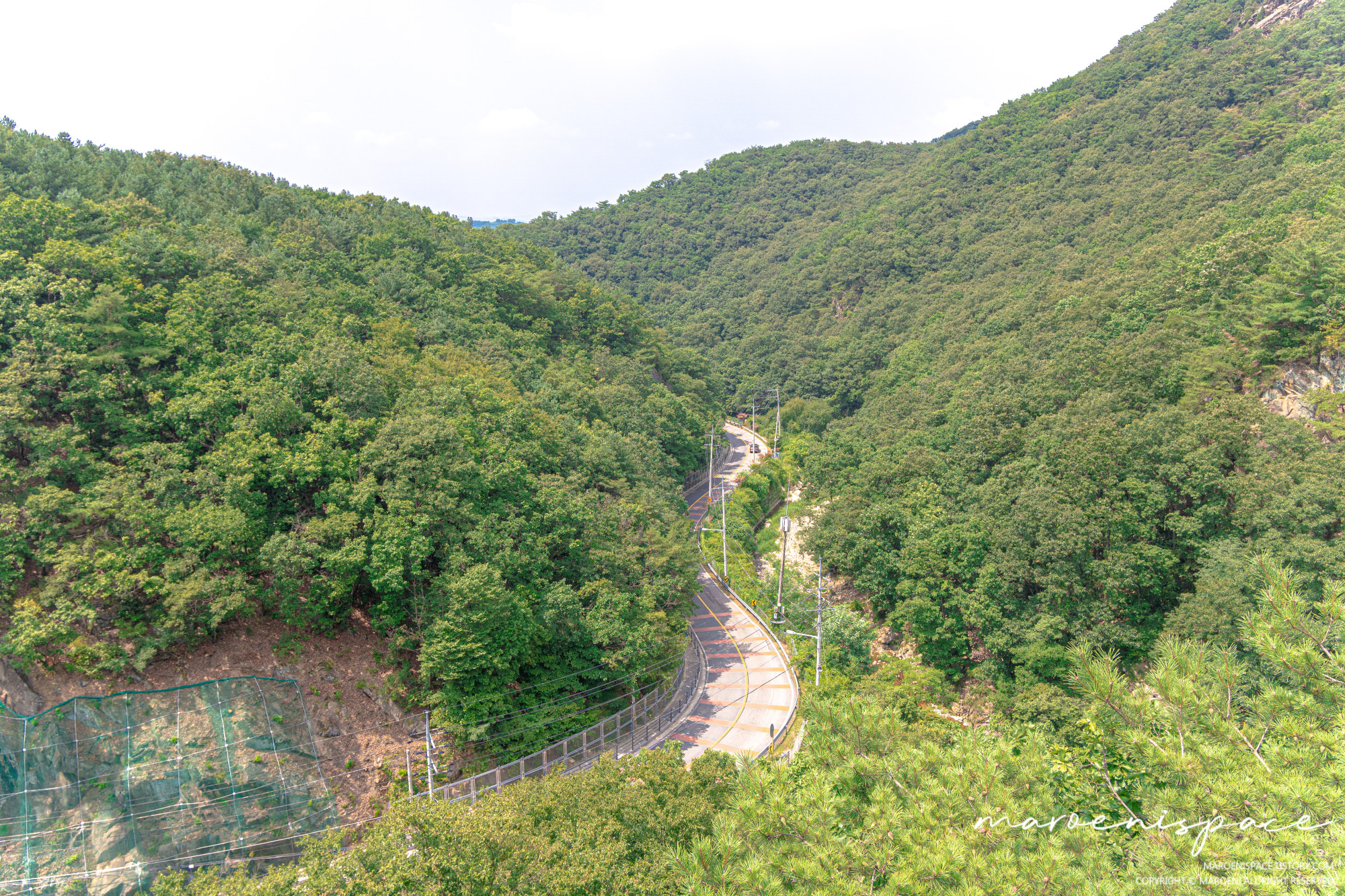 흔들다리 아래에는 호수가 있다면 출렁다리 아래에는 구불구불한 도로가 보입니다. 전망은 그럭저럭 나쁘지 않은 편.