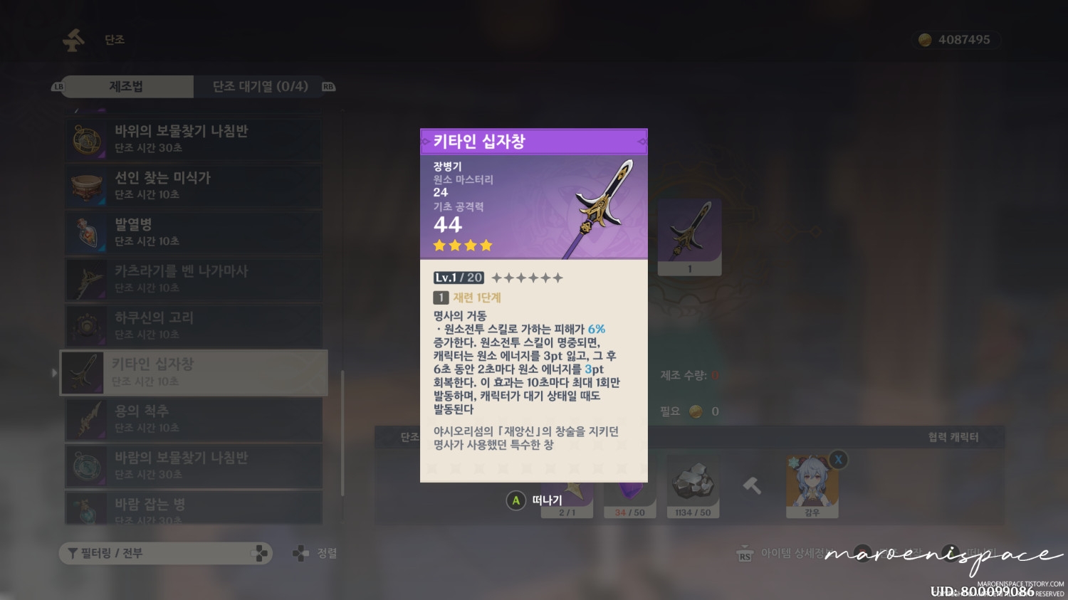 이나즈마 지역이 업데이트되면서 새로 추가된 장병기인 키타인 십자창은 원소 마스터리가 달려있으며 원소전투 피해량 증가 및 원소 에너지 반환 옵션을 가지고 있습니다. 레시피가 있어야만 제작할 수 있는데, 이번 포스팅에서는 키타인 십자창을 획득할 수 있는 퀘스트에 대해 공략합니다.
