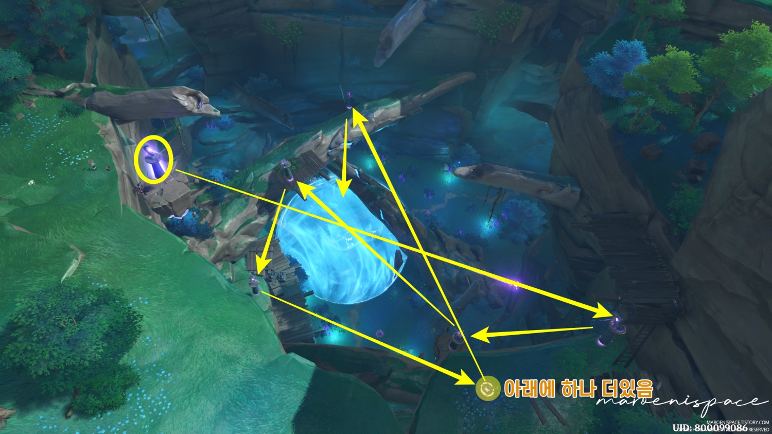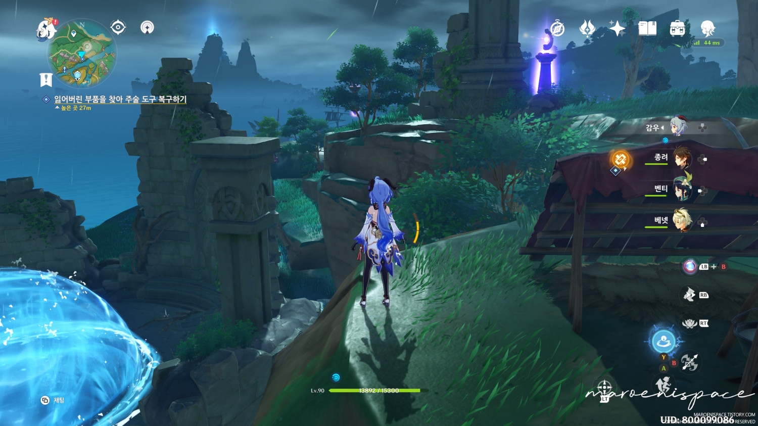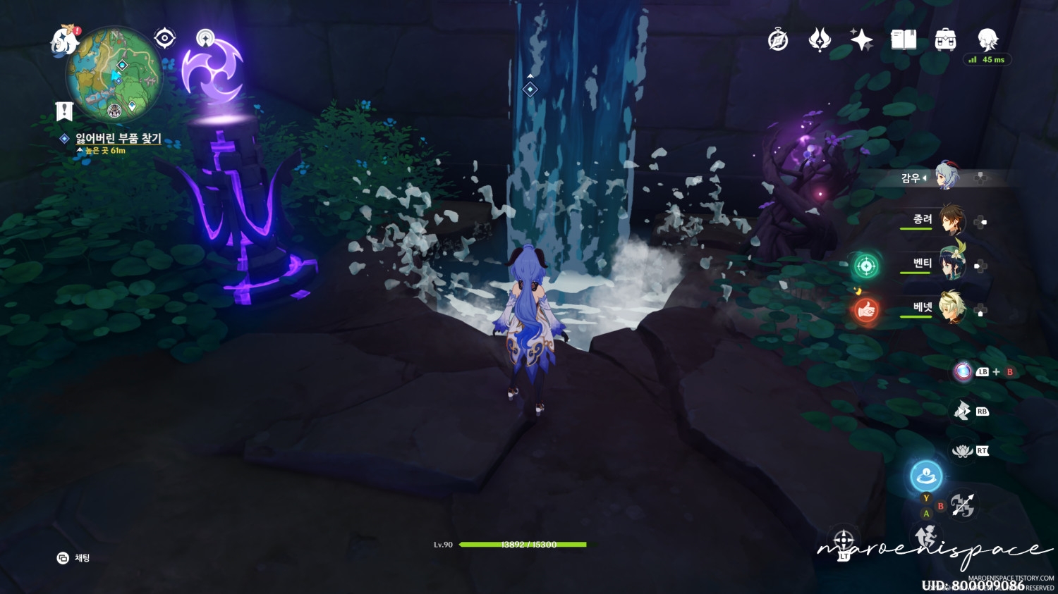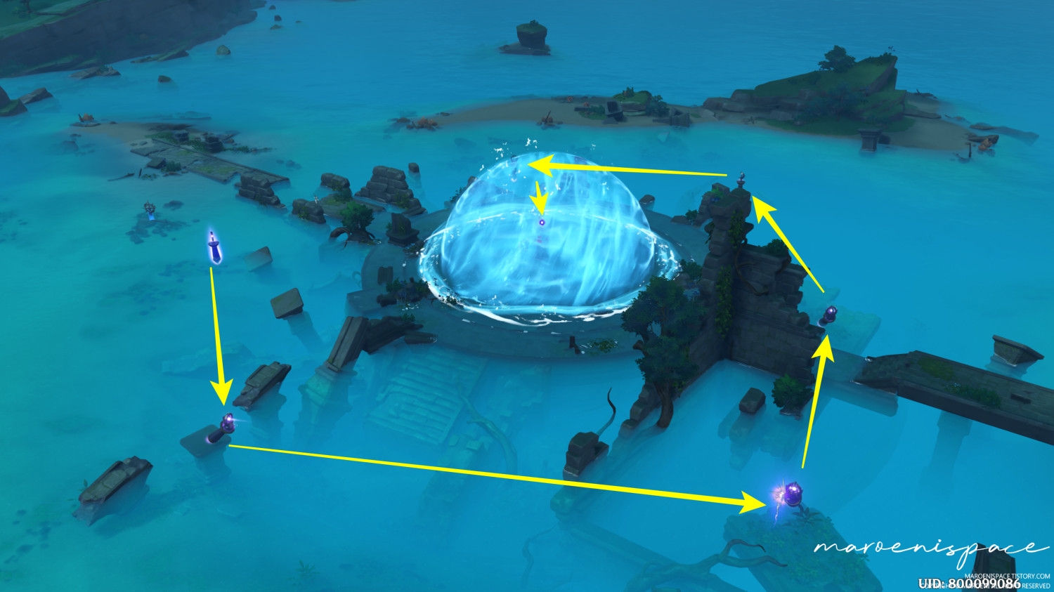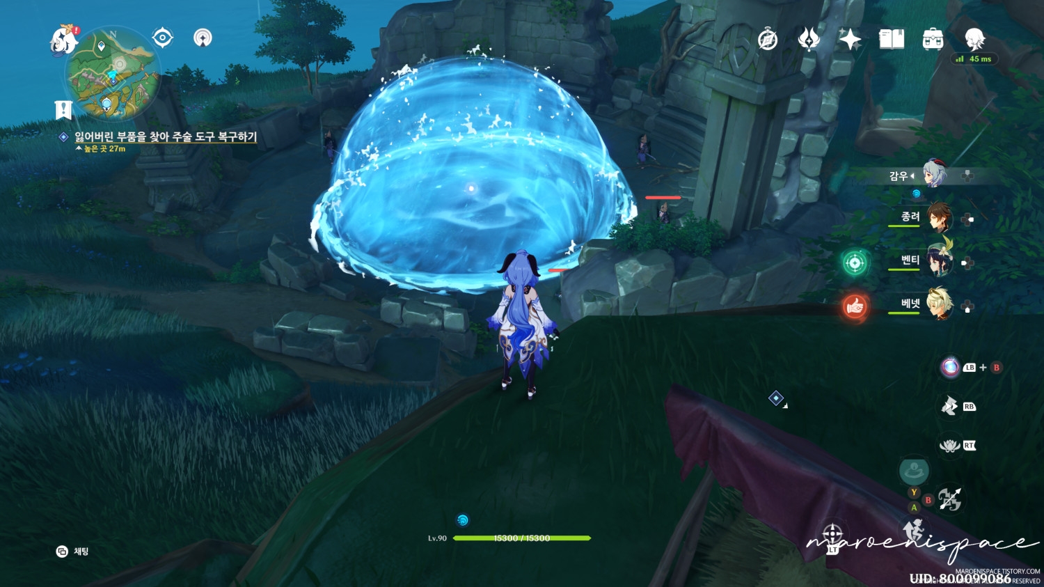 퀘스트에 표시된 제단에 말을 걸면 원소시야를 이용해 길을 따라가보라고 하는데, 첫 퀘스트는 그렇게 멀지 않은 곳에 있습니다. 원소시야를 따라가다 보면 물의 결계로 봉인된 장소가 나오는데, 이러한 장소를 정화해야 합니다. 주변에 있는 잡몹들을 처리하고..