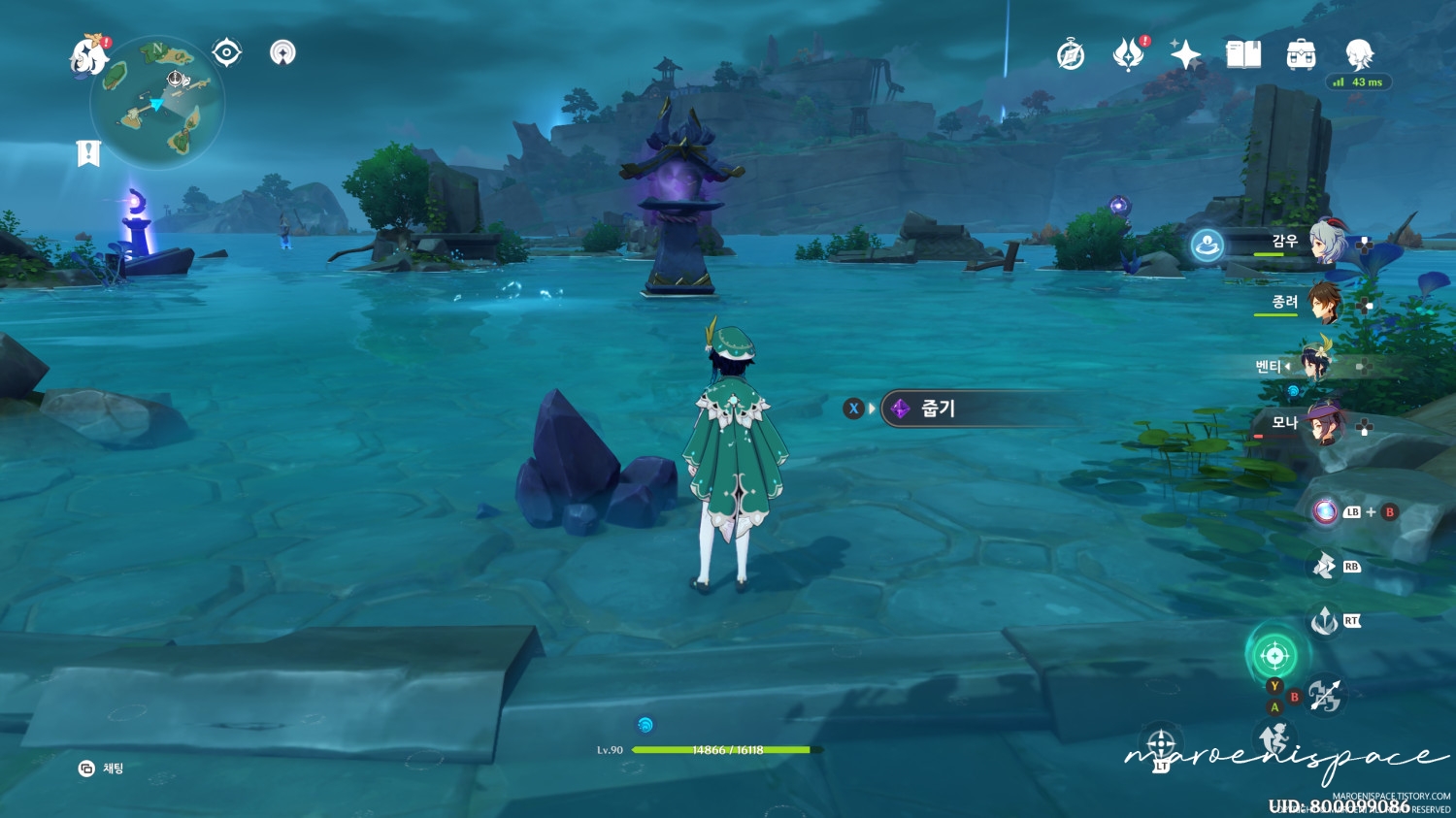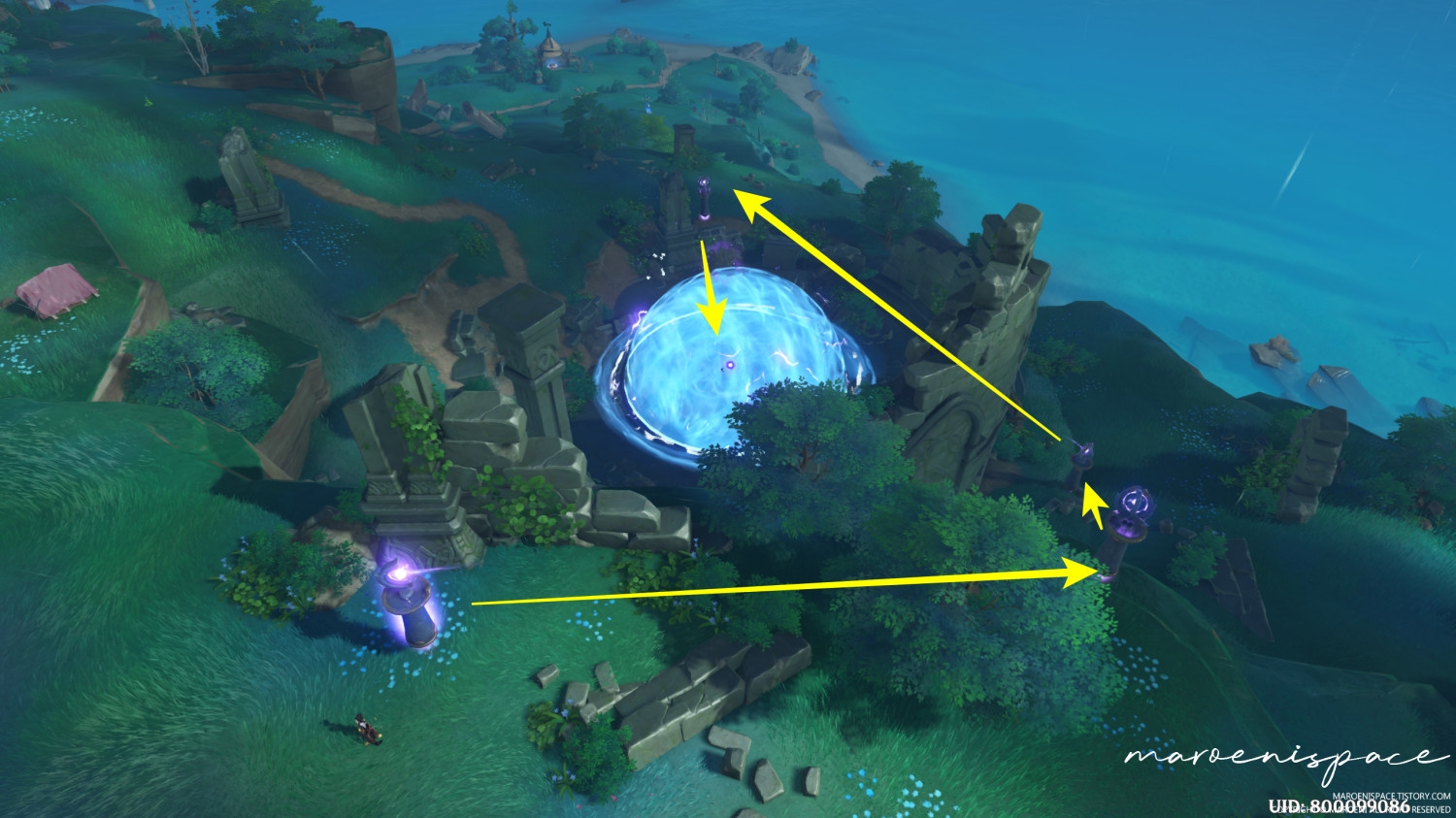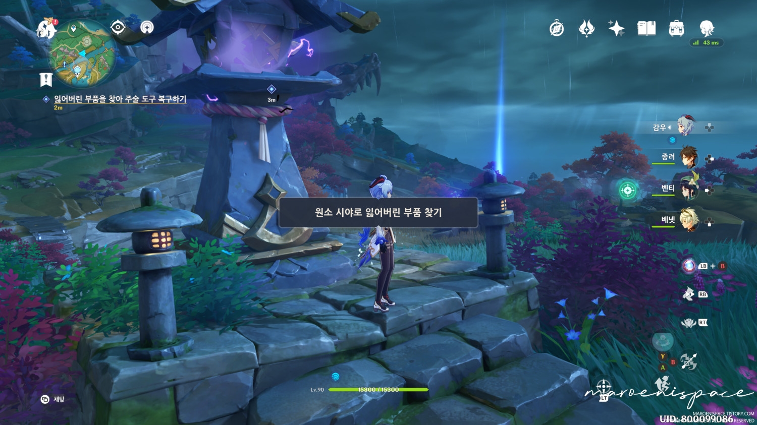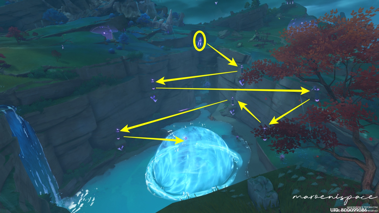 퀘스트에 표시된 제단에 말을 걸면 원소시야를 이용해 길을 따라가보라고 하는데, 첫 퀘스트는 그렇게 멀지 않은 곳에 있습니다. 원소시야를 따라가다 보면 물의 결계로 봉인된 장소가 나오는데, 이러한 장소를 정화해야 합니다. 주변에 있는 잡몹들을 처리하고..
