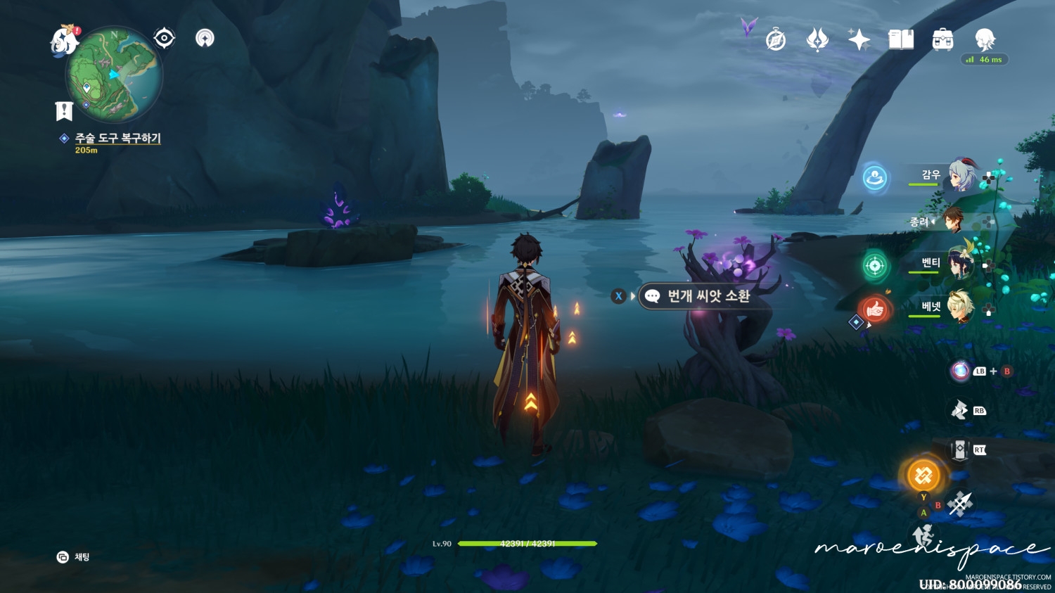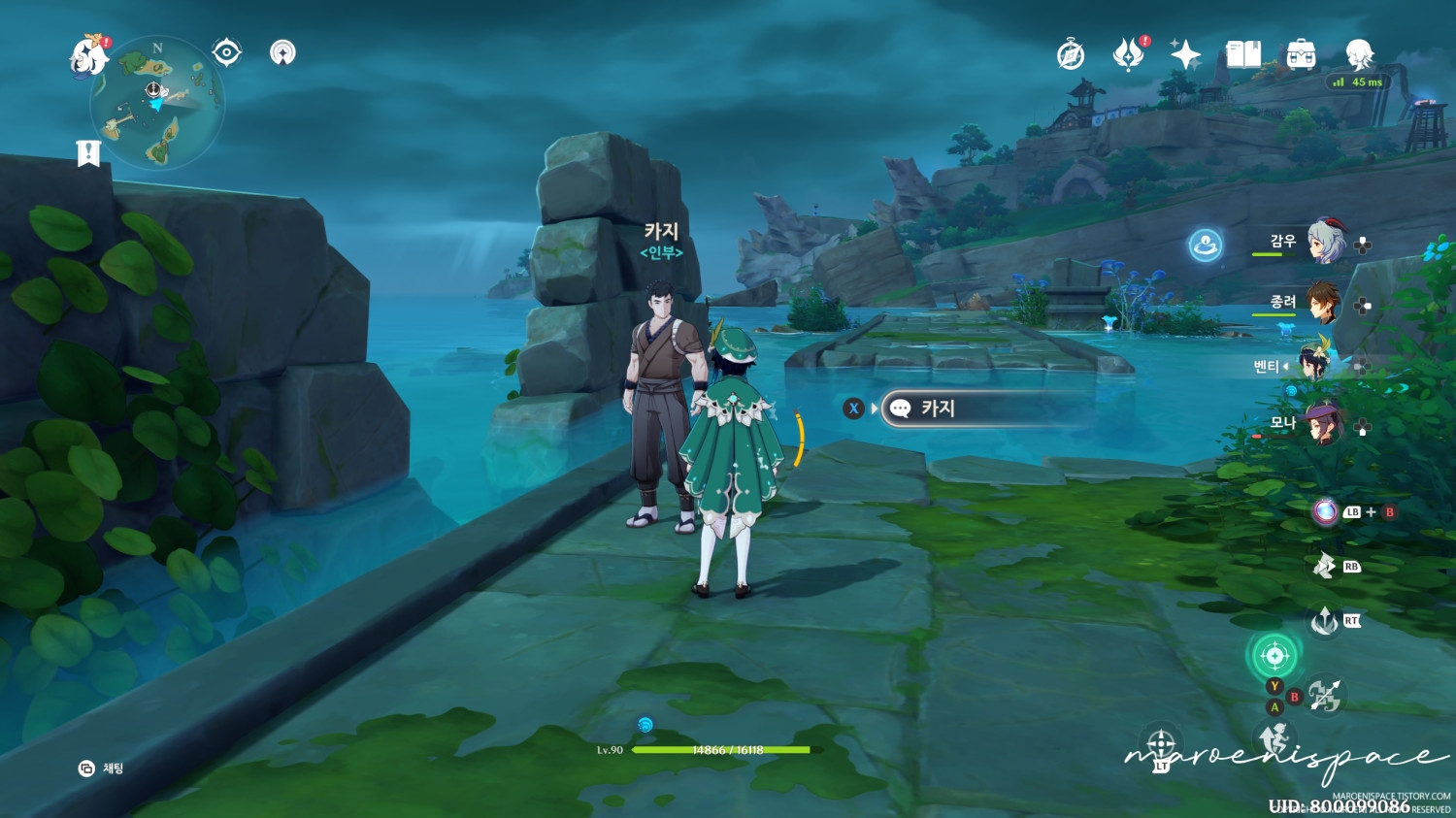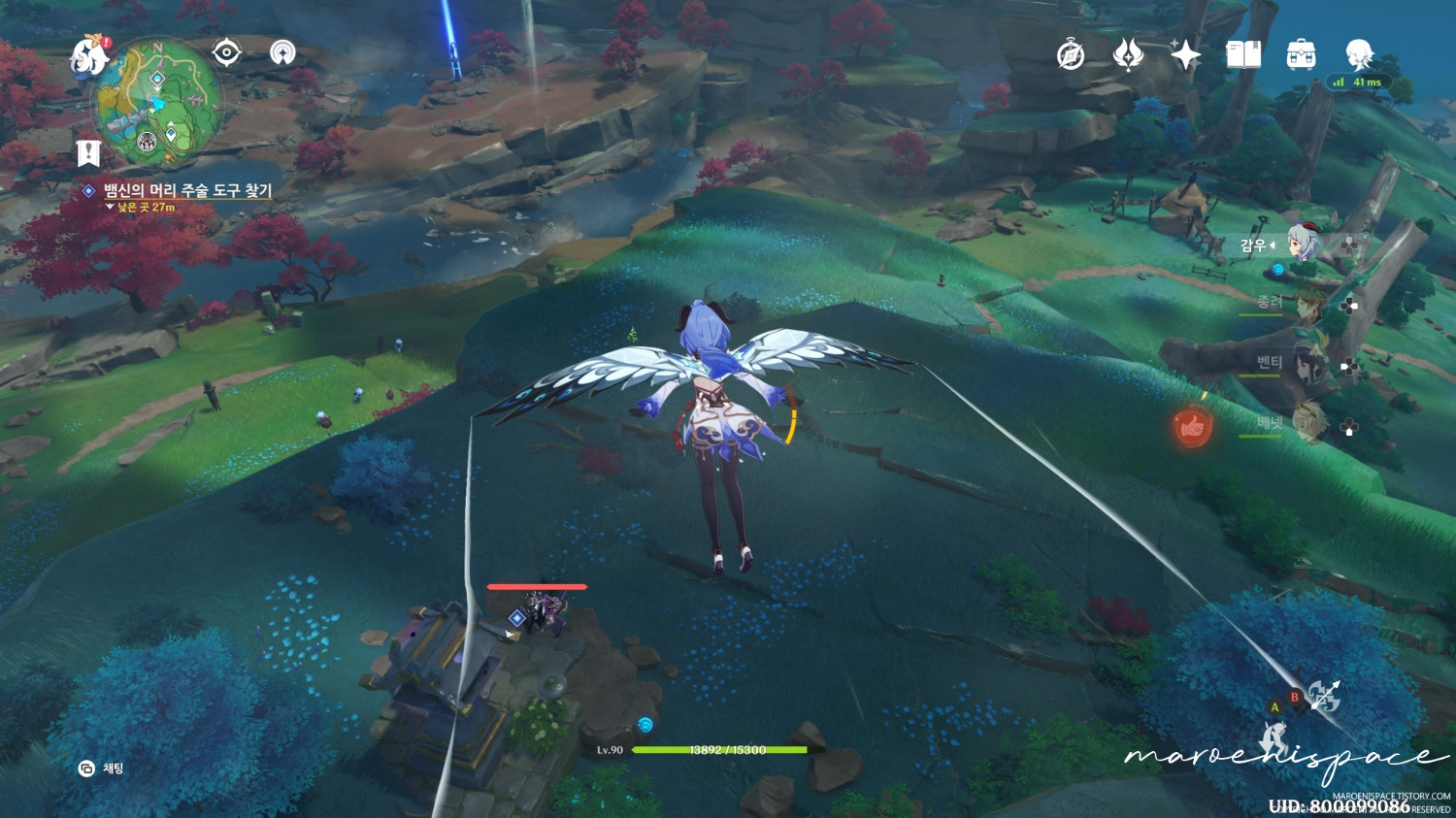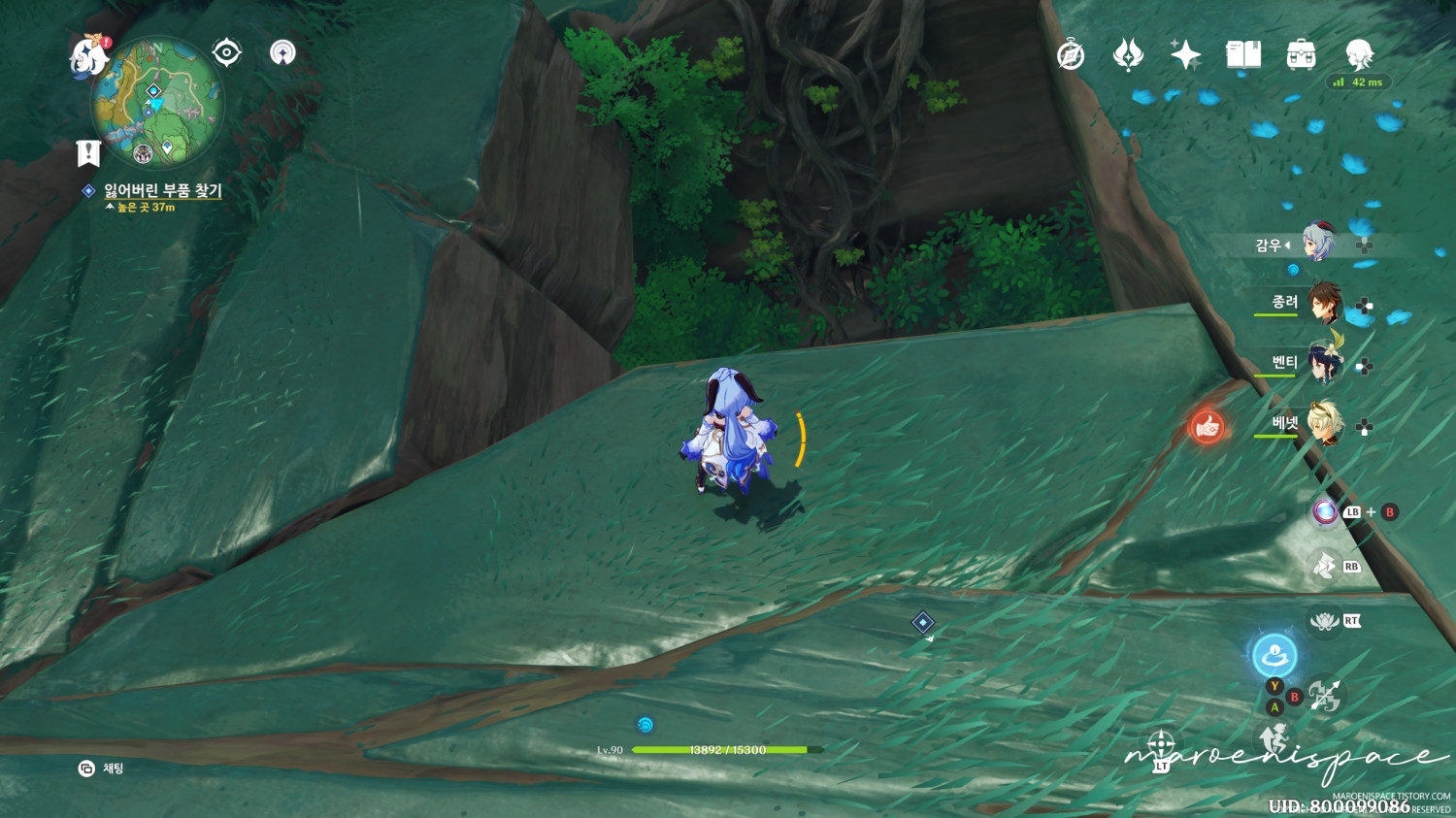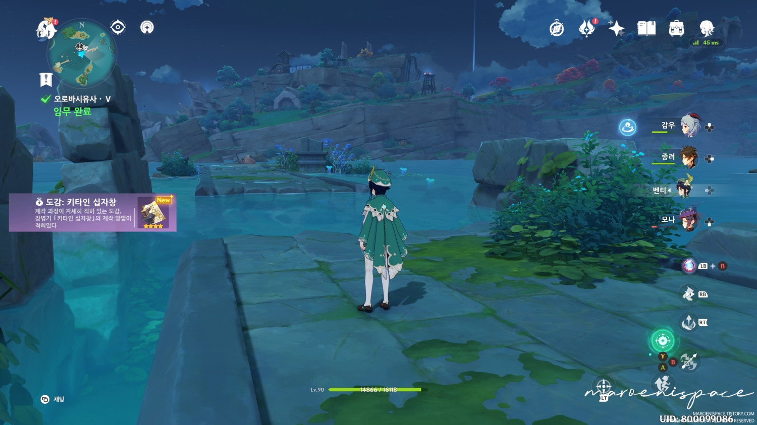 퀘스트에 표시된 제단에 말을 걸면 원소시야를 이용해 길을 따라가보라고 하는데, 첫 퀘스트는 그렇게 멀지 않은 곳에 있습니다. 원소시야를 따라가다 보면 물의 결계로 봉인된 장소가 나오는데, 이러한 장소를 정화해야 합니다. 주변에 있는 잡몹들을 처리하고..