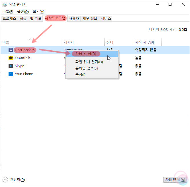 5) 4번까지의 방법만으로도 한컴오피스 자동업데이트 알림을 제거할 수 있지만 혹시라도 계속해서 한컴 업데이트 알림이 나타나는 분들은 CTRL+SHIFT+DTLETE키를 눌러서 작업관리자를 실행시킨 다음 상단의 시작프로그램 메뉴에서 HncCheck을 마우스 우클릭 후 사용 안 함으로 체크해주시면 됩니다.