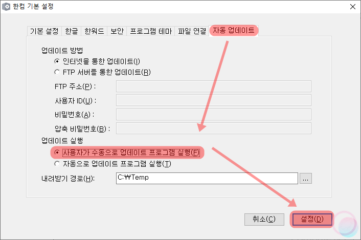 3) 상단 메뉴 중에서 자동 업데이트를 누르고 업데이트 실행 영역에 있는 선택 칸에서 사용자가 수동으로 업데이트 프로그램 실행을 체크하신 후 설정을 눌러주세요.