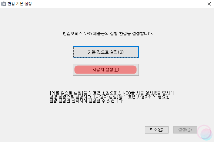 2) 한컴 기본 설정 화면이 나타나면 사용자 설정을 눌러줍니다.