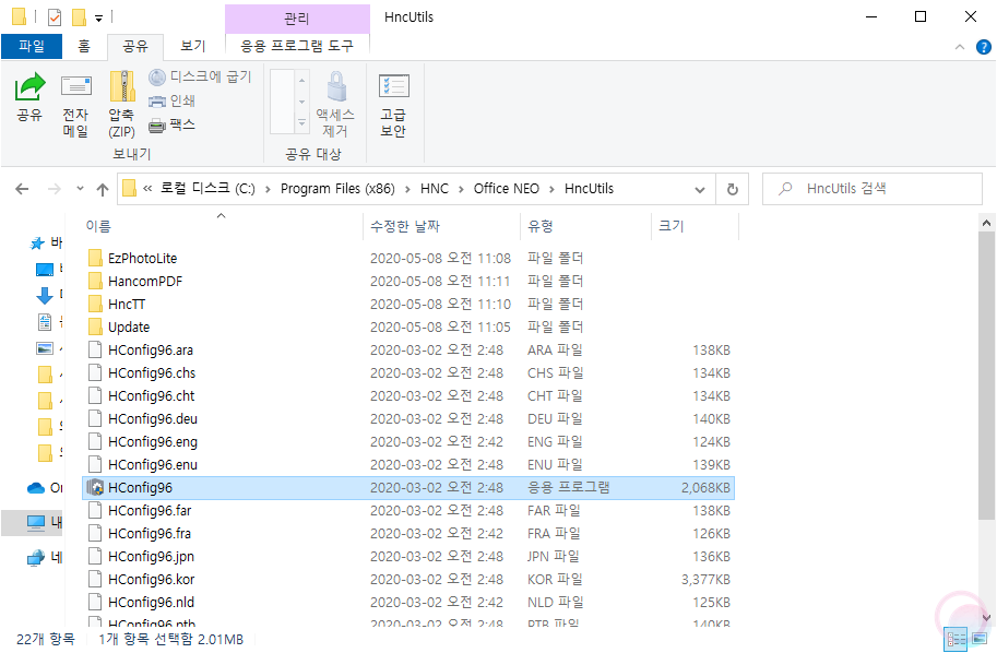 1) 한컴오피스가 설치된 경로인 C:\Program Files (x86)\HNC\Office NEO\HncUtils로 이동해줍니다. 저는 한컴 네오버전이 설치되었기에 Office NEO 경로가 추가되었는데, HNC폴더 안에서 HncUtils만 찾아주시면 됩니다.