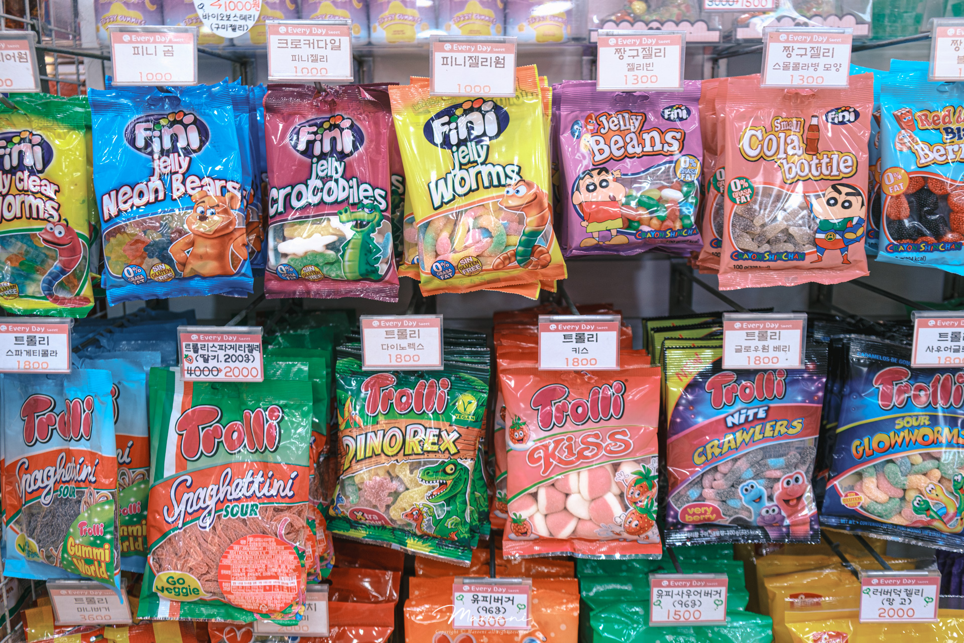 시장 끝에 있는 젤리 가게! 다른 가게들은 노란색 조명을 사용하는데 여기만 흰색 조명을 사용해서 그런지, 매장 안의 분위기가 엄청 깨끗한 느낌이 들었어요. 수입과자랑 각종 간식들을 판매하던데 요즘 이런 매장이 너무 많아서 딱히 특별한 느낌은..