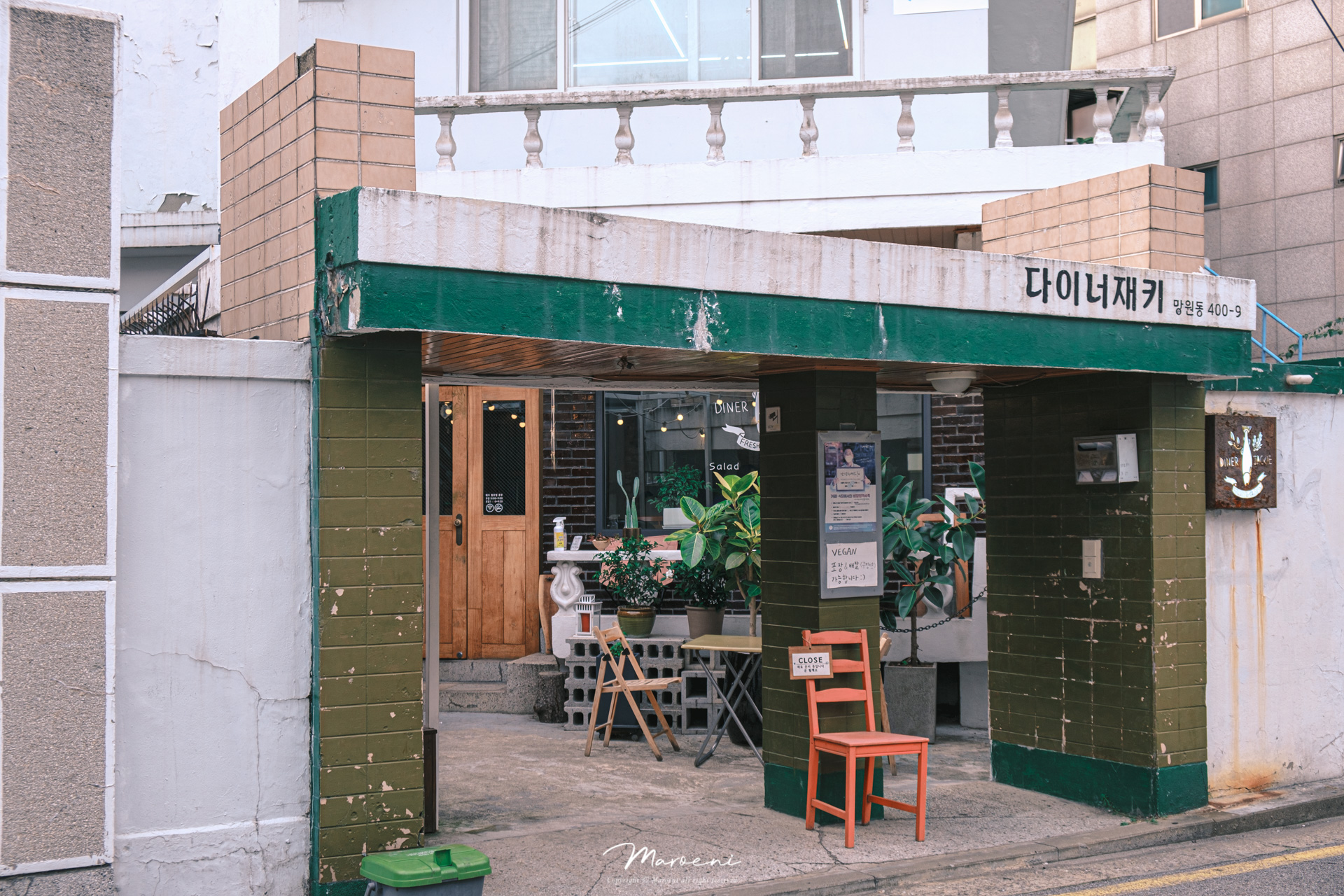 밖으로 나와보니 맞은편에 다이너재키라는 매장이 있었어요. 여긴 뭘 파는 곳인지 궁금해서 인터넷으로 찾아보니 비건식 전문점이라고 하네요!? 메뉴판을 보니 두부로 만든 음식도 있는 것 같았고 연어로 만든 롤 같은 음식도 판매하는 것 같았어요.