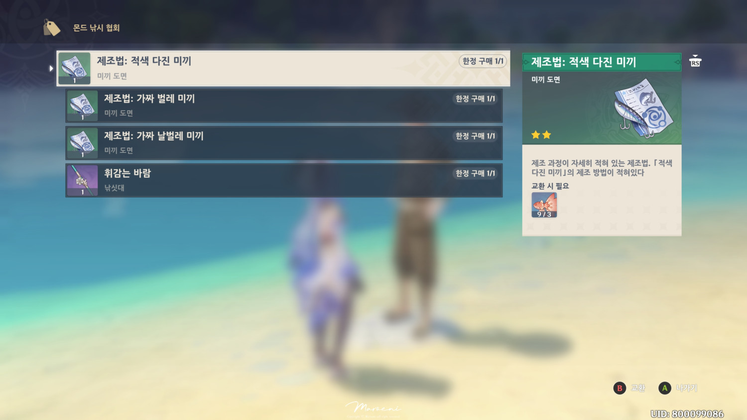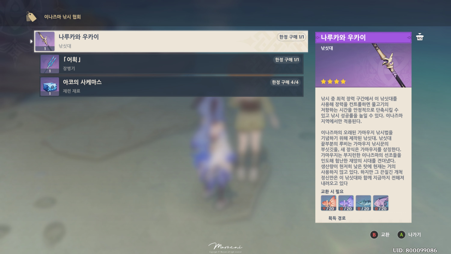 나루카와 우카이 낚싯대와 어획 장병기, 아코의 사케마스는 이나즈마 지역의 쿠지라이 모미지에게 구매할 수 있습니다.