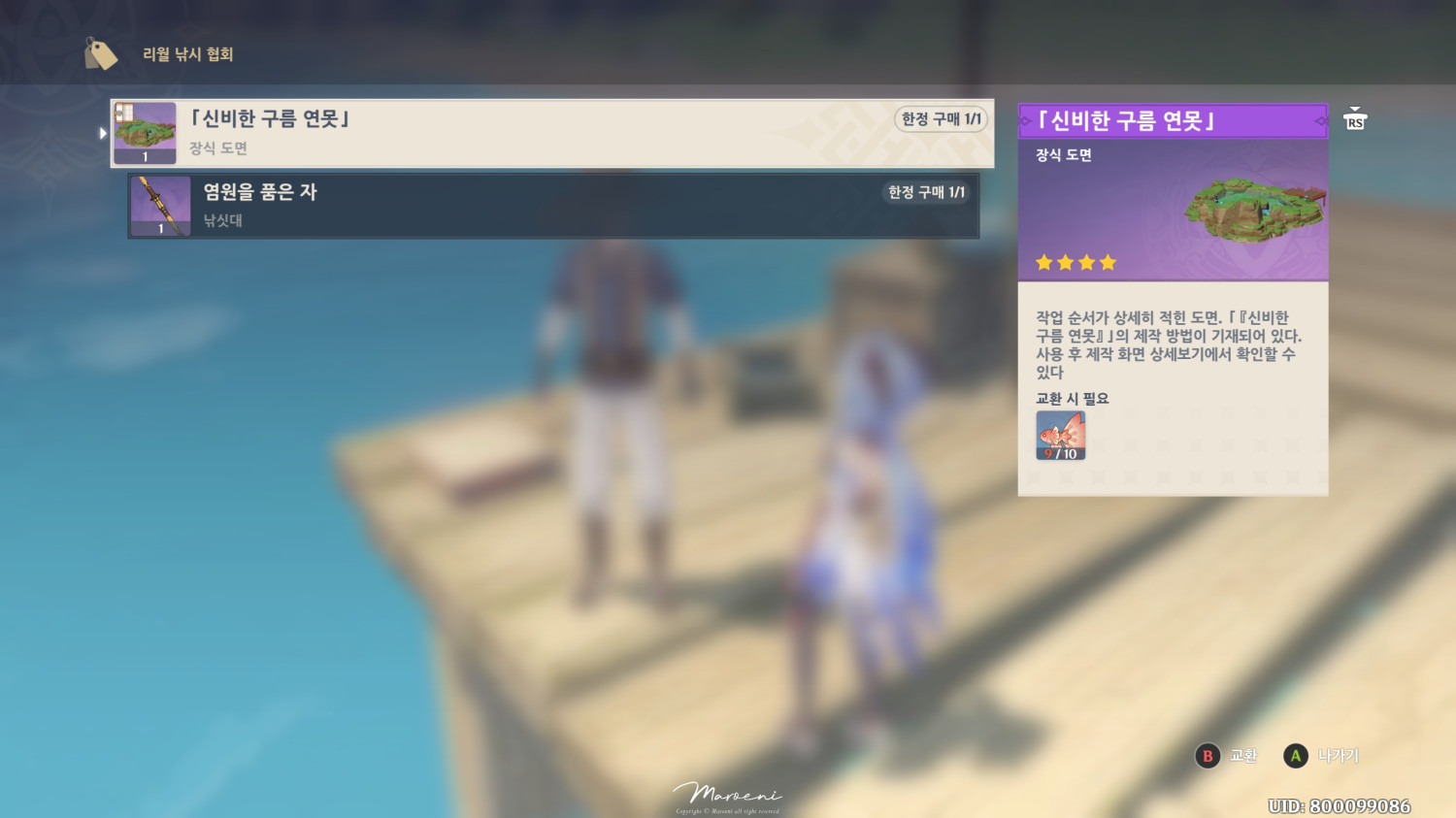 신비한 구름 연못과 염원을 품은 자 낚시대는 리월 지역 가온에게 구매할 수 있습니다.