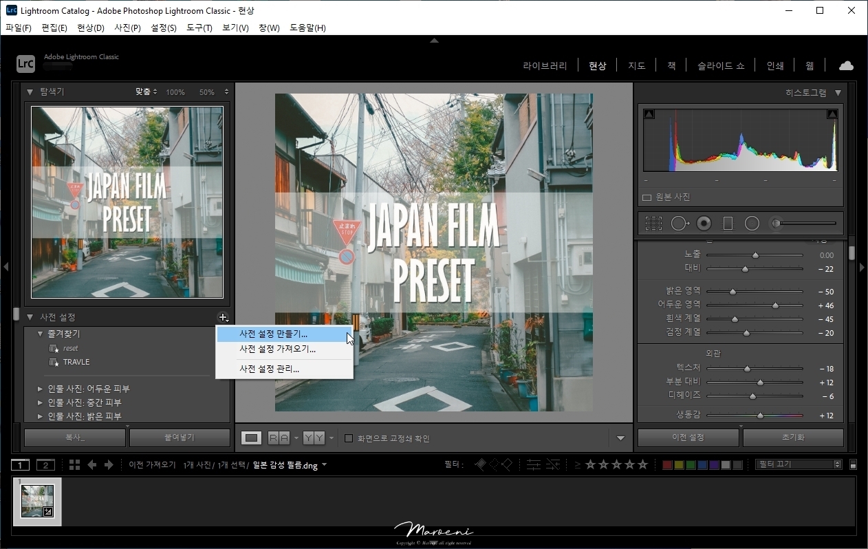 하지만 현상탭으로 이동해보시면 이미지이지만 노출, 대비, 색상 등등 여러 값들이 변경되어 적용된 것을 확인할 수 있는데요. 이 이미지는 이미 프리셋이 적용된 이미지로 사용자는 여기에 적용된 프리셋을 저장해서 사용하기만 하면 되는 것이죠.
