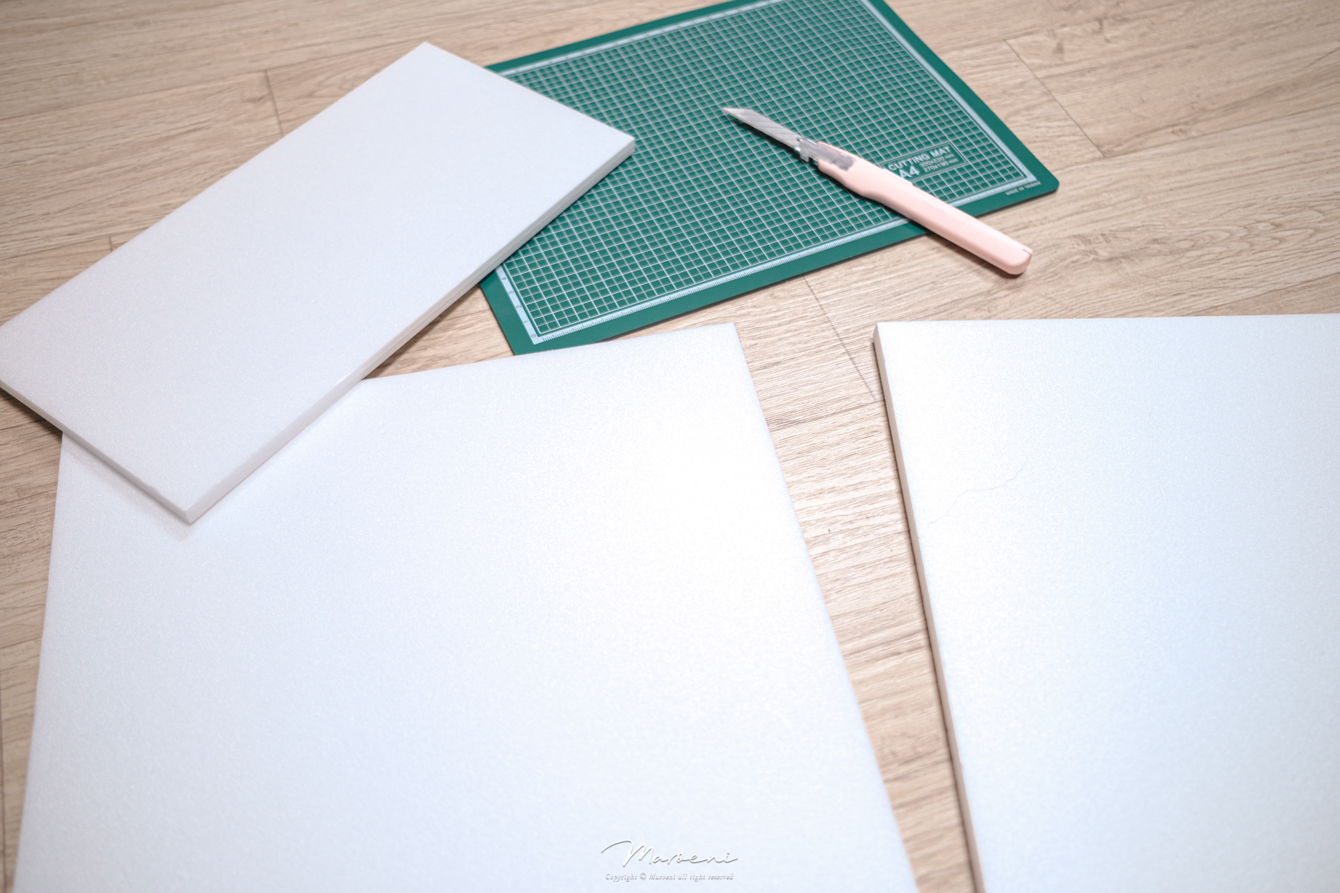 저는 칼질을 최대한 덜하기 위해 다음과 같은 방법을 사용했는데요. 먼저 옆면을 만들기 위해 하나는 가로로 놓고, 다른 하나는 세로로 놓은 상태로 세로의 보드를 가로 보드에 맞게 잘라주었어요. 왼쪽과 오른쪽 면을 만들어주어야 하기 때문에 총 2장을 잘라주시면 됩니다.