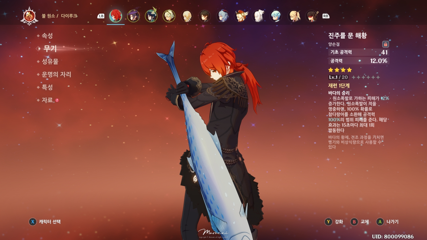 첫날에 모든 축월 부적과 현월의 보물상자를 획득할 경우 최종 보상으로 진주를 문 해황(일명 생선 대검)이라는 이벤트 장비를 획득할 수 있습니다. 진주를 문 해황은 원소 폭발 피해량 증가와 원소폭발시 참다랑어를 소환하는 효과를 가지고 있어서 다이루크처럼 원소 스킬을 자주 돌리는 캐릭터에게 유용한 장비인데요.