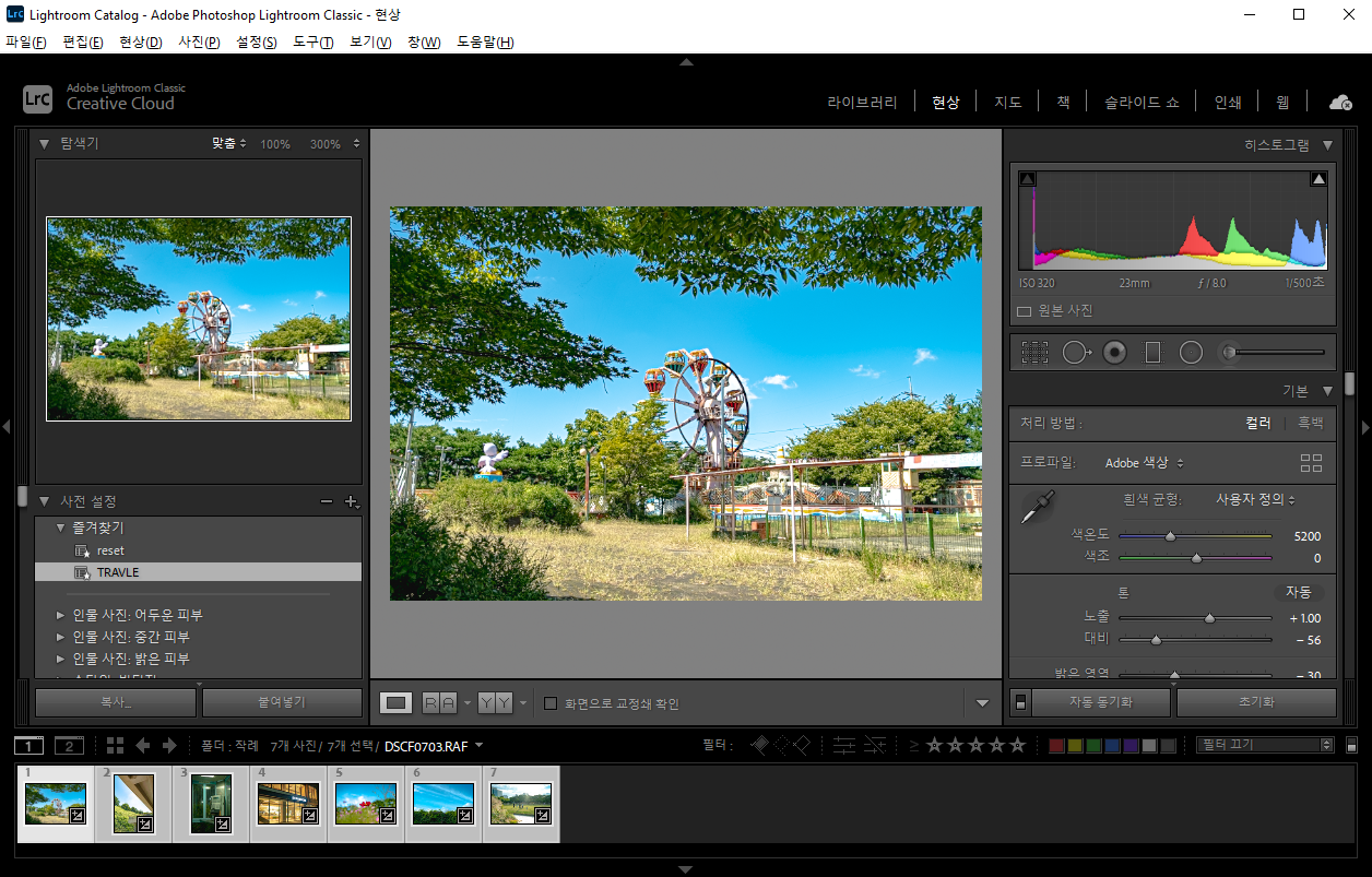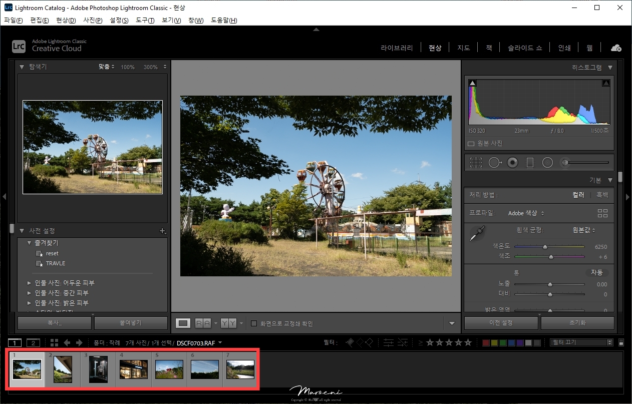 먼저 라이트룸으로 프리셋을 일괄적용할 사진들을 불러와준 후 현상탭으로 넘어옵니다.