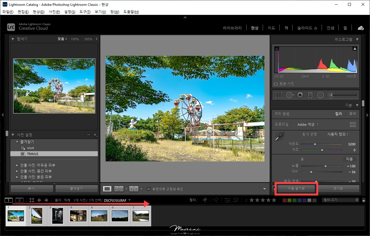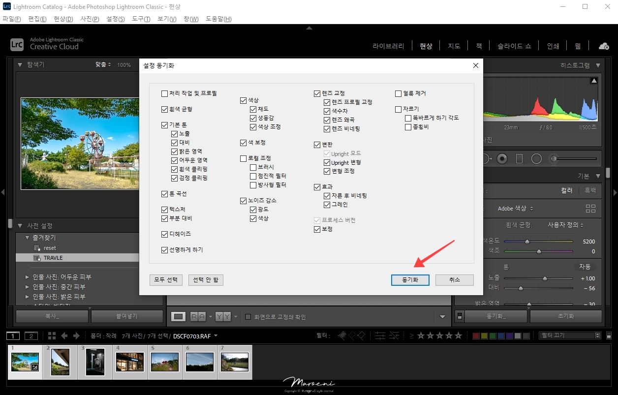 보정된 사진의 프리셋 값을 바탕으로 원본 사진을 동기화시킬 수 있는 창이 나타납니다. 여기서 본인이 원하는 항목만 체크해준 후 동기화 버튼을 누르기만 하면 모든 사진이 동일한 프리셋으로 적용되는 것을 확인할 수 있어요.