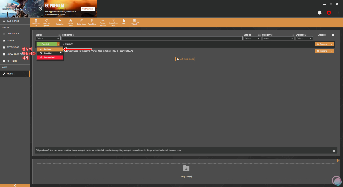 VORTEX의 장점은 모드를 다운받고 파일만 드래그하여 추가만 하여도 현재 어떤 모드가 설치되어 있는지 쉽게 확인이 가능하고 설치된 모드를 목록에서 선택하여 삭제하는 것이 가능하기에 이제 막 모드를 설치하는 초보자분들에게 정말 유용한 프로그램이라 생각됩니다.