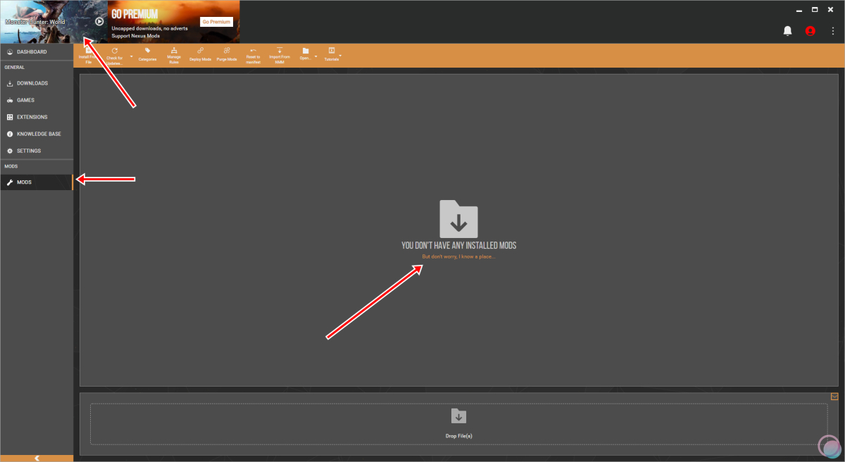 아직은 VORTEX를 통해 설치한 모드가 없기 때문에 아무것도 표시 되지 않을 것입니다. 여기서 모드를 다운받기 위해 중앙에 위치한 작은 주황색 글씨 But don`t worry, i know a place...를 눌러줍니다.