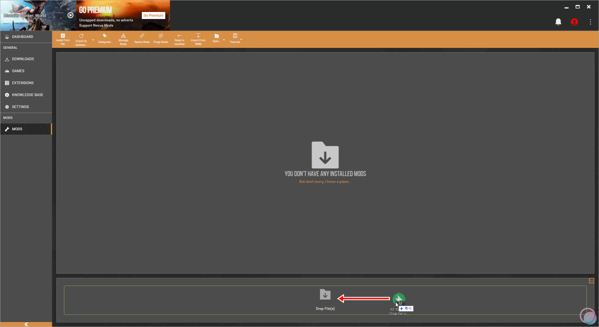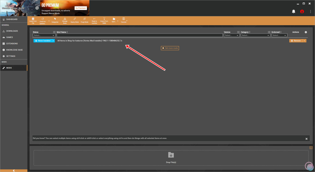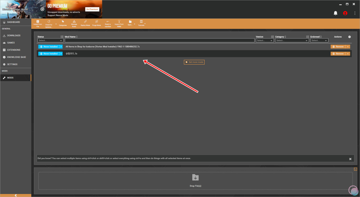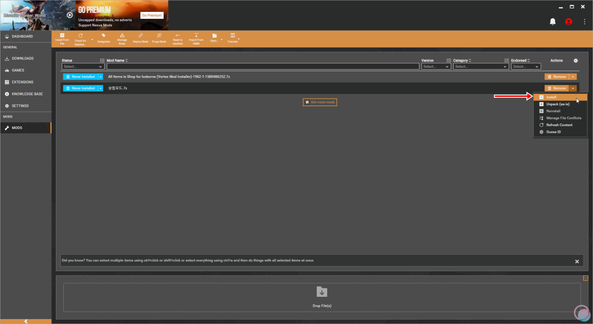 5) 이제 다운받은 모드를 VORTEX를 이용해 설치해보도록 하겠습니다. 압축 파일을 하단의 Drops File(s)영역으로 드래그해줍니다.