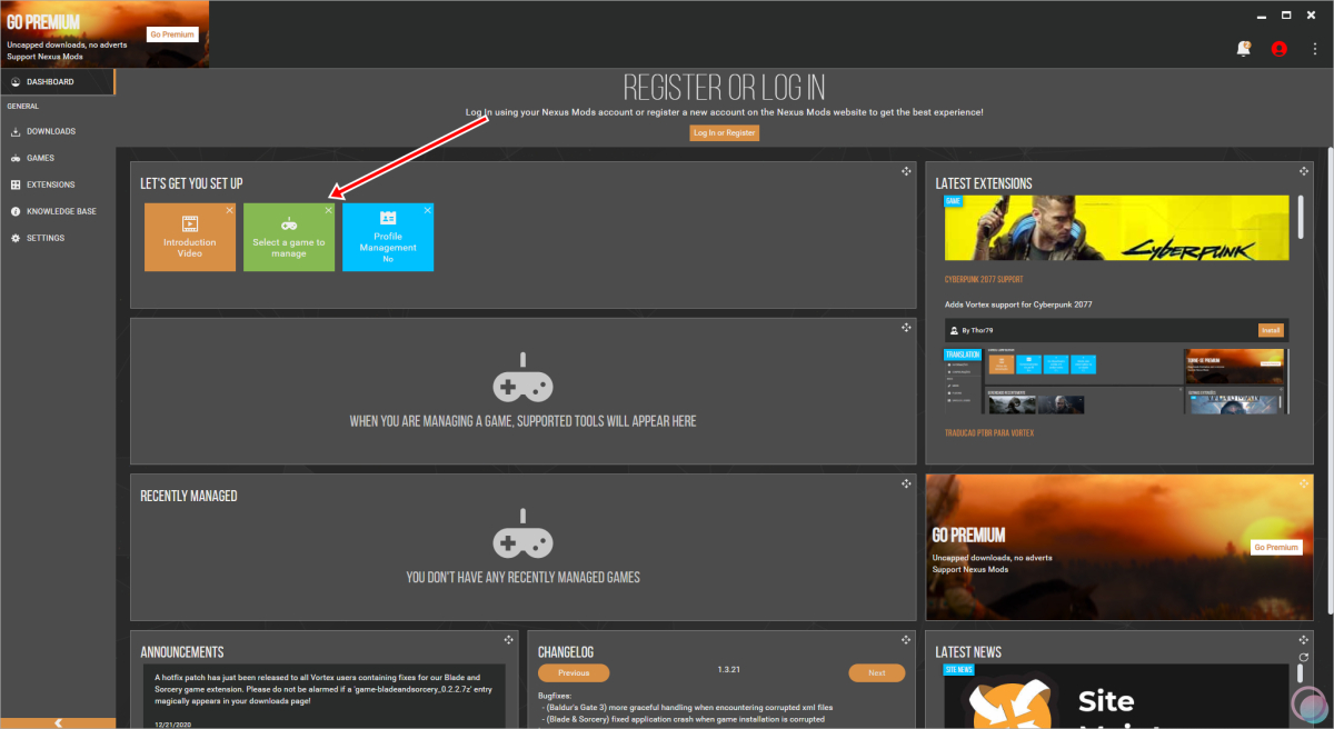 1) VORTEX를 최초로 실행하면 다음과 같은 화면을 만나볼 수 있습니다. 우선 자신이 사용중인 게임을 VORTEX에 등록하기 위해 상단의 Select a game to manage를 선택합니다.