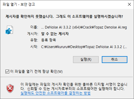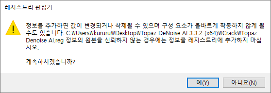 동봉되어있는 Topaz Denoise AI.reg 레지스트리 파일을 실행하여 레지스트리를 등록까지만 해주시면