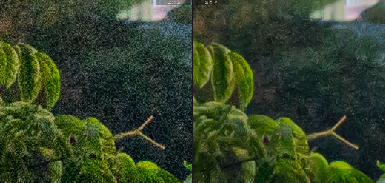 이번에는 다른 영역을 크롭해서 비교해보겠습니다. 마찬가지로 라이트룸으로 노이즈를 감소시킨 사진인데, 하단을 보면 지렁이가 일렁거리는 것을 발견할 수 있을 뿐만 아니라 노이즈를 제거하였음에도 불구하고 약간의 노이즈가 남아있는 것을 확인할 수 있습니다.