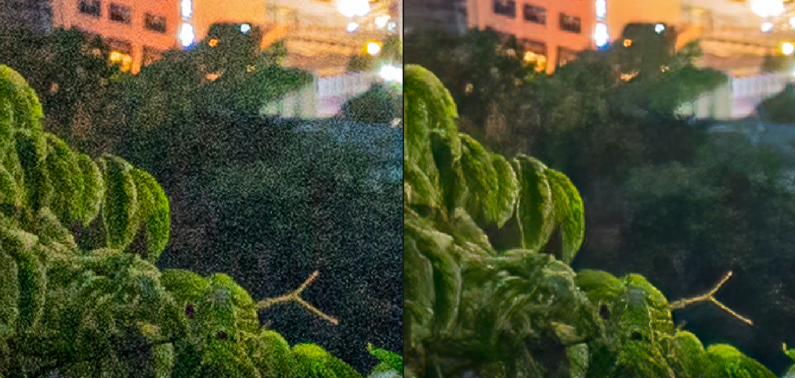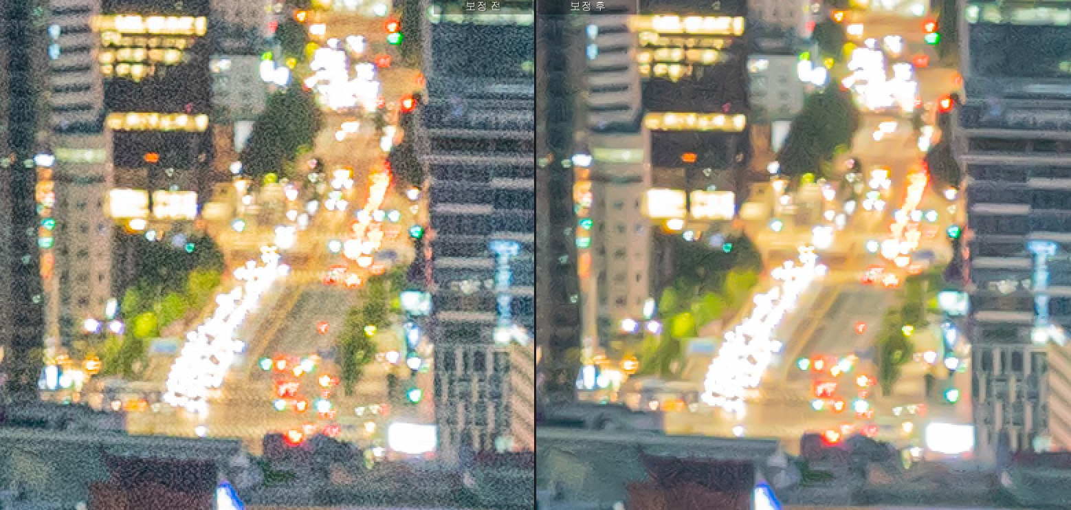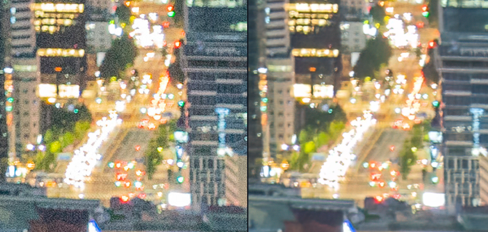 마찬가지로 왼쪽이 원본이고 오른쪽이 토파즈 디노이즈 AI를 통해 노이즈를 통해 얻어낸 결과물입니다. 머신 러닝 기반의 알고리즘을 이용하여 사진에 끼어있는 노이즈 패턴을 분석하고 제거하기 때문에 노이즈가 억제되었을 뿐만 아니라 디테일이 크게 뭉개지지 않았음을 확인할 수 있습니다.