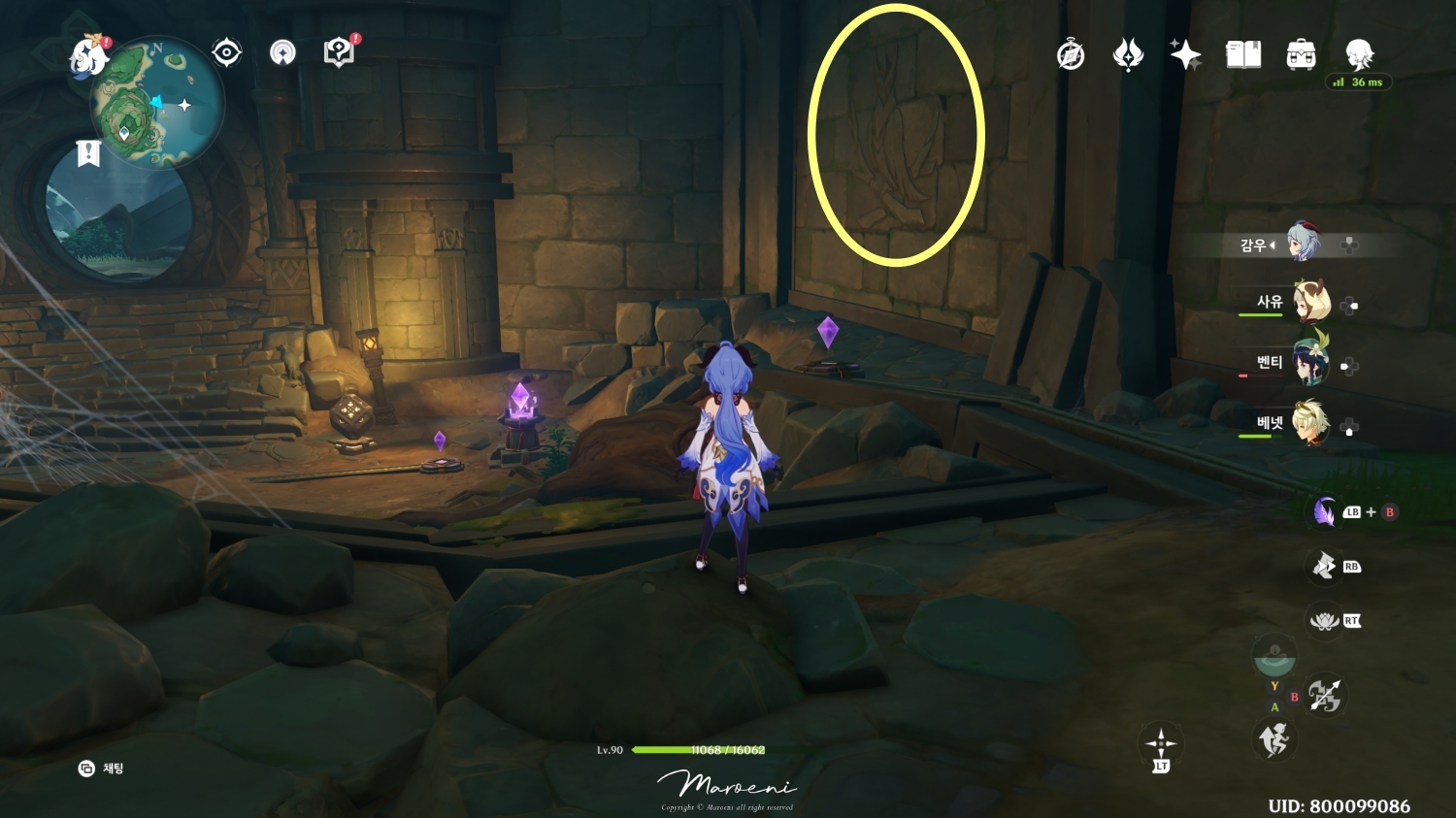 벽화가 그려진 방 앞, 물이 고여있었던 장소로 뛰어내리면 뇌조의 벽이 보이는데 벽을 없앤 후 눈동자를 챙겨줍니다.