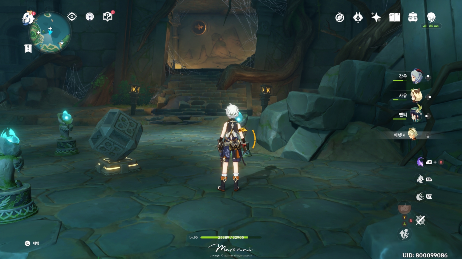우선 입구에 들어가면 보이는 공짜 기믹부터 풀어주고 상자를 하나 달달하게 먹어줍니다. 불의 원소로 사진에 표시된 4개의 기둥을 활성화해주면 끝!