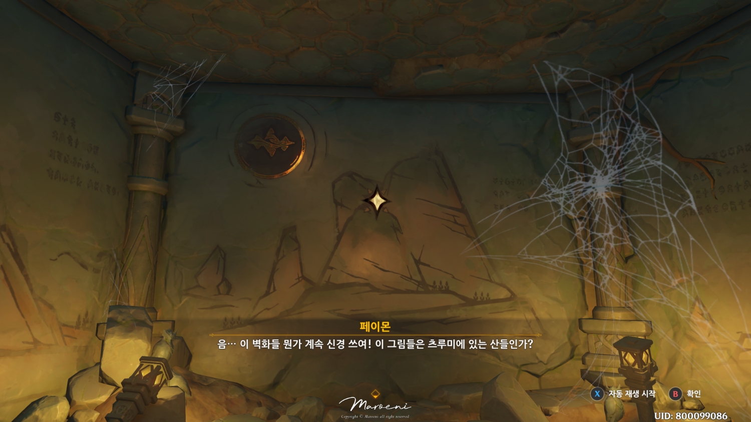 우선 이 기믹은 이나즈마성 NPC 스미다의 두 번째 퀘스트까지 진행한 후 사용 아이템인 독특한 깃털을 획득해야만 합니다! 일단 스미다의 첫 번째 퀘스트인 <안개를 따라, 서목을 찾아 공양하기>를 진행하다 보면 시리코로산 지하의 계전석 퍼즐 장치 입구 오른쪽 벽면에 사진과 같은 뇌조가 그려져 있는 벽을 볼 수 있는데