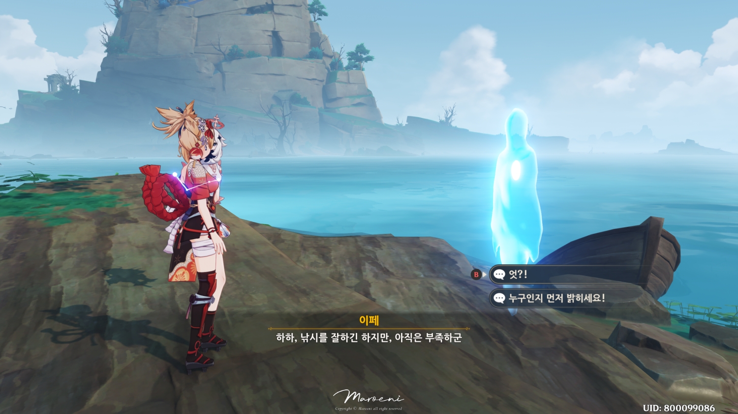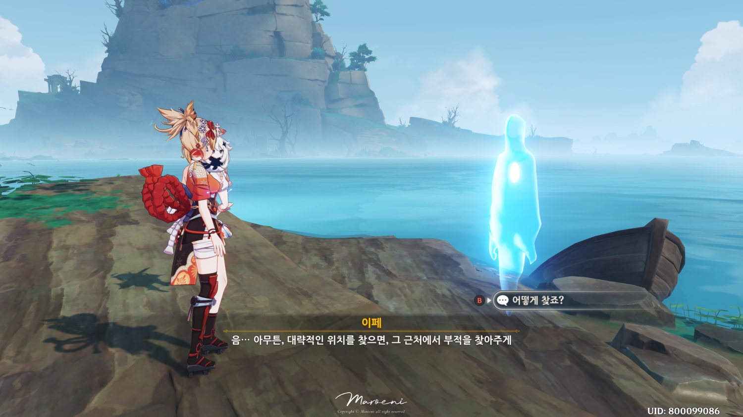 치라이 신사 낚시 포인트에서 물고기를 한 마리라도 잡게 될 경우 이페라는 유령 NPC가 나타납니다. 이페는 부적을 잃어버렸다며, 낚시를 통해 부적을 가져와달라고 하는데요. 낚시 지역은 치라이 신사가 아닌