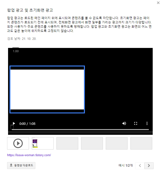 예시를 눌러보니 이슈여자(바로가기)라는 티스토리와 짤친놈 저장소(바로가기)라는 티스토리가 애드센스의 정책을 무시하고 광고를 사용했기 때문에 발생한 문제라고 한다. 나 자신이 아닌, 타인에 의해 경고를 받아본 것이 처음이라 조금 의아했지만 이 두 명의 티스토리 운영자 때문에 티스토리 도메인을 사용하는 모든 애드센스 이용자가 경고를 받았다고 하니 기분은 썩 좋지 못했다.
