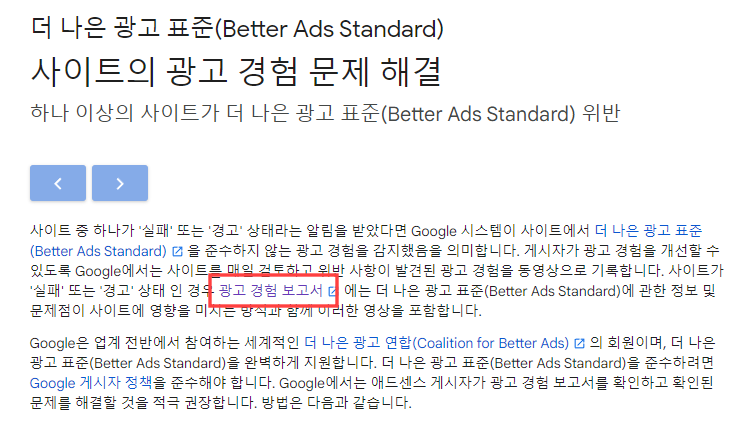 자세히 알아보기를 누르면 더 나은 광고 표준 사이트의 광고 경험 문제 해결을 위한 해결 방안이 나타나는데, 여기서 광고 경험 보고서를 누르면 정확한 원인을 파악할 수 있다고 한다.