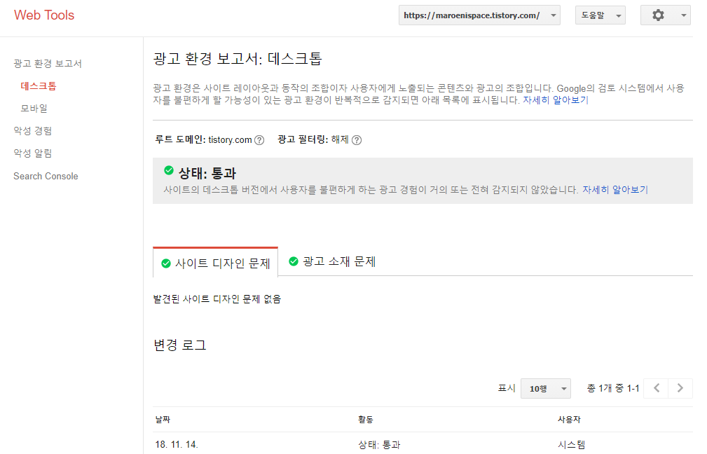다음과 같은 화면이 나타나면 왼쪽 메뉴 광고 환경 보고서에서 데스크톱을 선택해보니 데스크톱은 통과 상태이다.