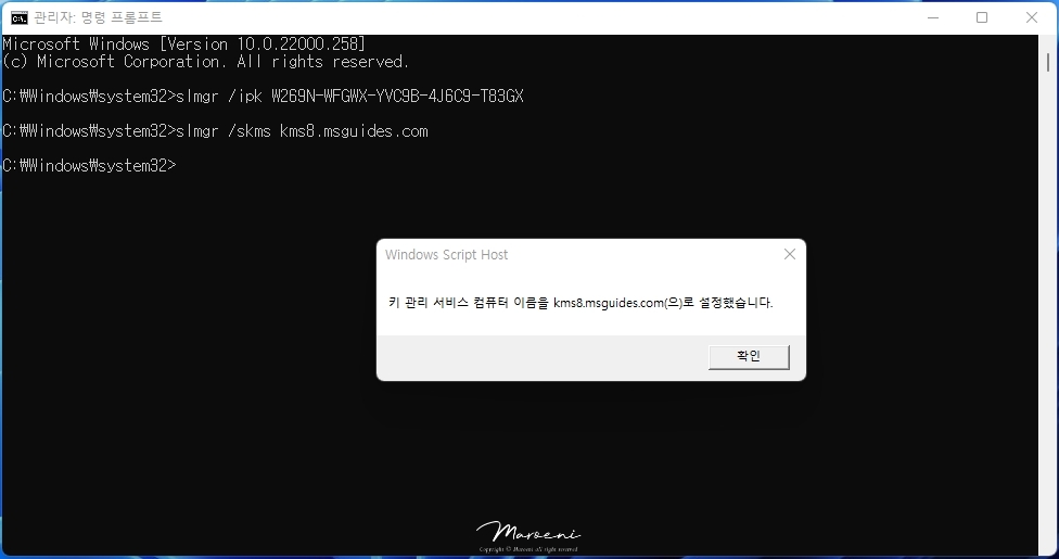 명령 프롬프트가 관리자 권한으로 실행되면 자신의 윈도우 버전에 맞는 제품키를 slmgr /ipk 뒤에다가 입력해주세요. 만약 윈도우11 Pro 버전을 설치했다면 slmgr /ipk W269N-WFGWX-YVC9B-4J6C9-T83GX를 입력해주시면 됩니다. 명령어를 입력할 때마다 알림창이 나타나는데, 이 알림창을 확인한 후 다음 과정으로 진행하시면 됩니다.