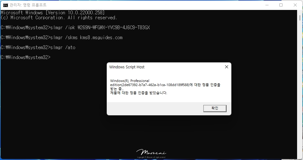 이제 제품키를 이용하여 정품등록을 하기 위해 다음 명령어를 입력해준 후
