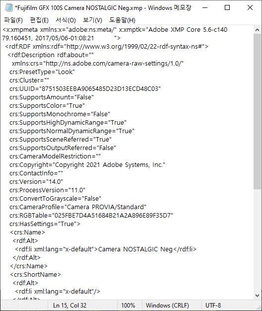 상단의 경로로 이동하면 라이트룸에서 지원하는 후지 전용 프로필들을 찾을 수 있습니다. 공통적인 필름 시뮬레이션을 제외한 블리치 바이패스, 클래식 네거티브와 같은 xmp 파일들을 볼 수 있는데 이 파일을 수정하는 것만으로도 상위 기종의 필름 시뮬레이션을 라이트룸에서 프로필 형식으로 불러오는 것이 가능해집니다.