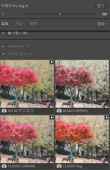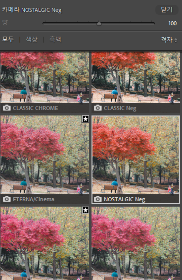 라이트룸에서 필름 시뮬레이션을 프로필 형태로 지원해주고 있지만, 이 역시도 사용 중인 기종에 해당되는 필름 시뮬레이션만 지원해주고 있기 때문에 뭔가 살짝 아쉬움이 남습니다.