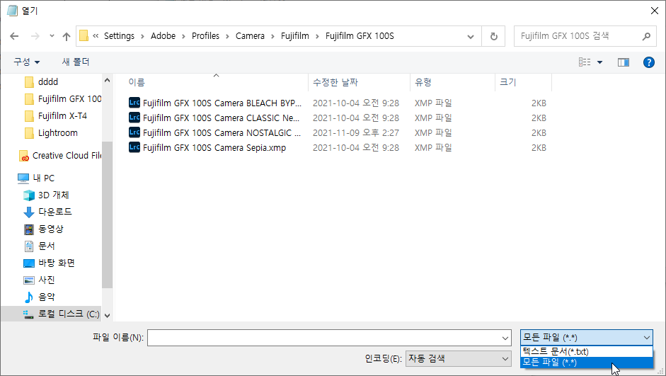 메모장에서 파일-열기를 해준 후 모든 파일로 선택하고 사용하기를 원하는 필름 시뮬레이션을 선택해주세요. 저는 X-T4에서 사용할 수 없는 노스텔직 네거티브 프로필을 수정해보겠습니다.