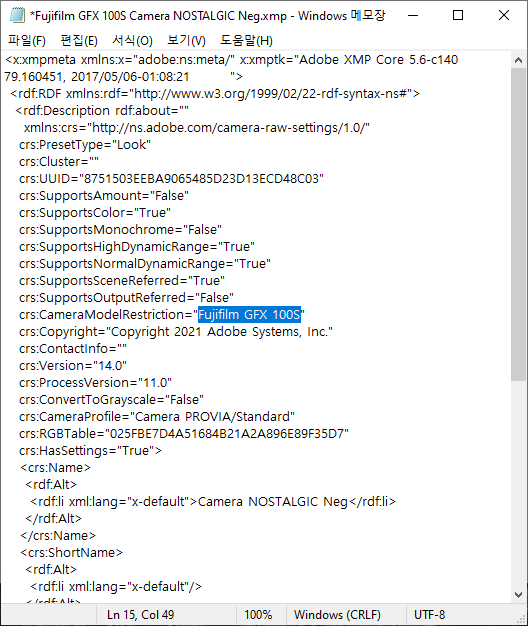 메모장으로 xmp를 불러왔다면 crs:CameraModelRestriction="바디 이름" 이 부분에서 바디 이름을 지운 후 저장하시면 끝입니다.
