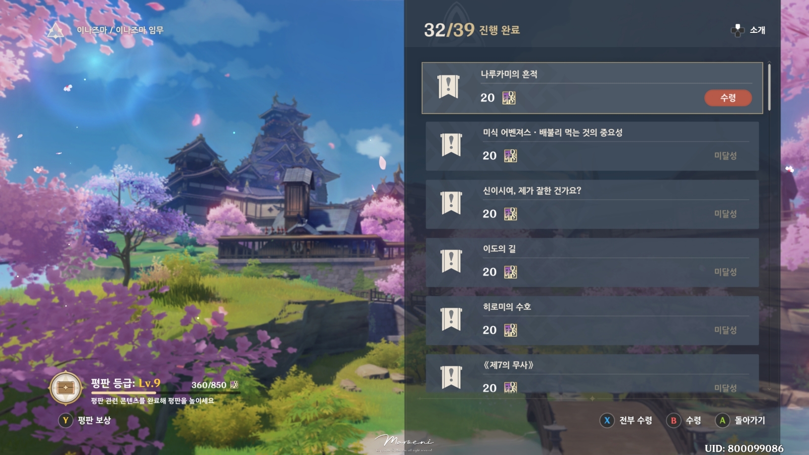 퀘스트를 끝까지 진행하면 <그녀와 그녀의 고양이>라는 업적과 함께 이나즈마 평판 퀘스트인 <나루카미의 흔적>을 클리어하게 됩니다.