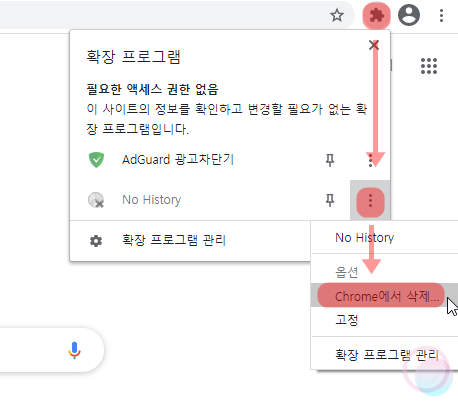 3) 별다른 설정을 하지 않아도 설치만 하면 모든 것이 끝납니다. 이제 크롬 브라우저를 이용해 구글 검색창에서 원하는 검색어를 입력해보세요. 이전처럼 검색어가 중복입력되는 문제가 발생하지 않을 것입니다. 삭제할 때에는 크롬 상단 메뉴에서 퍼즐 모양의 아이콘을 누른 후 no history 오른쪽의 점 3개를 눌러주고, 크롬에서 삭제 버튼을 눌러주면 됩니다.