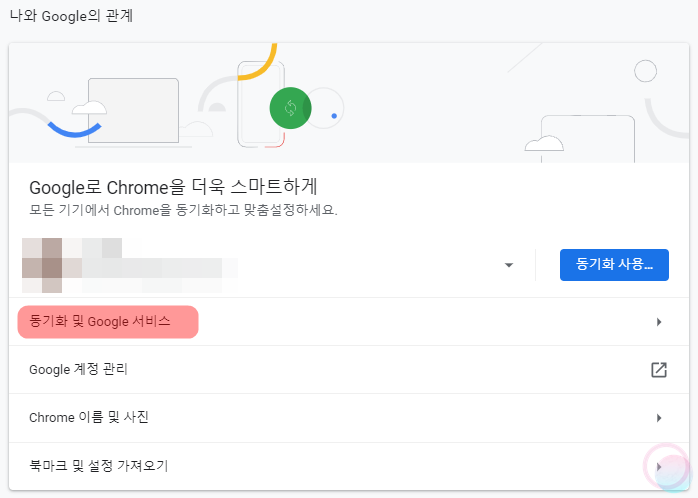 1) 크롬을 실행한 후 설정-동기화 및 Google 서비스로 이동합니다.