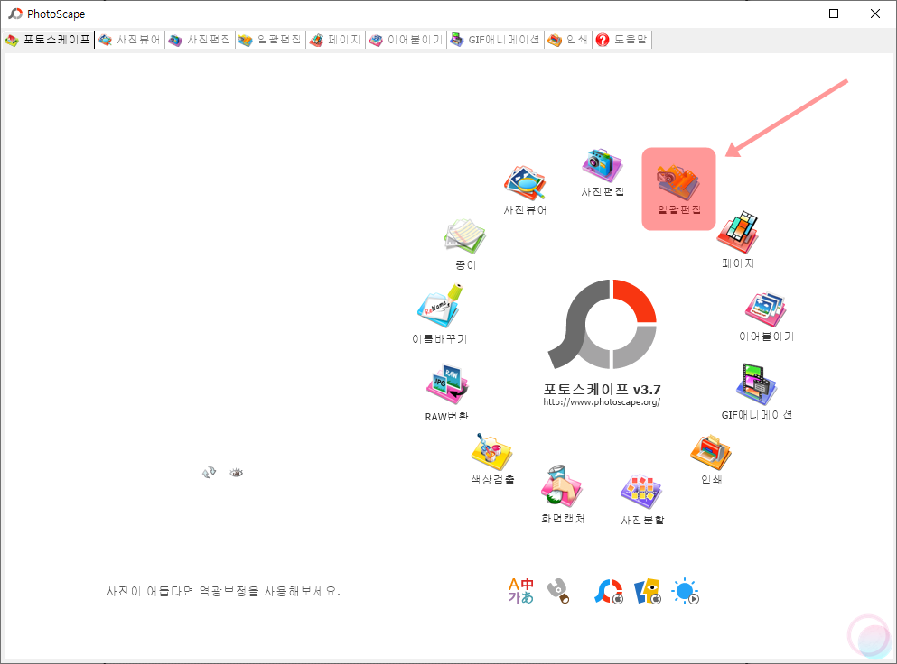 1) 포토스케이프 공식 홈페이지를 통해 포토스케이프를 설치해줍니다. 포토스케이프는 포토샵이 설치되어 있지 않을 때 간편하게 사진을 수정할 수 있는 프로그램으로 EXIF 정보 제거 뿐만 아니라 여러 방면으로 활용 가능한 유명 소프트웨어 중 하나이니 안심하고 설치하셔도 됩니다. 포토스케이프를 설치 후 실행하였다면 메인 화면에서 일괄편집을 선택해줍니다.