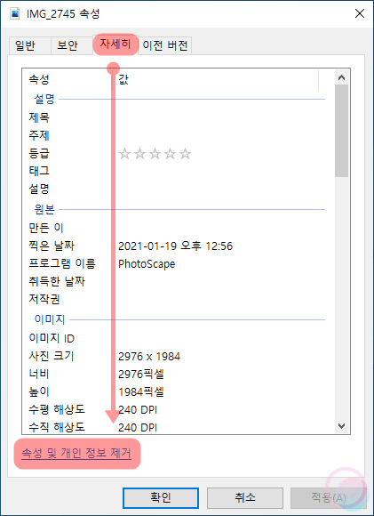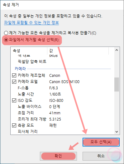 파일의 속성-자세히 영역 하단을 보면 속성 및 개인 정보 제거라는 항목을 선택해줍니다. 이후 파일에서 제거할 속성 선택을 눌러주어 삭제할 정보를 개별 선택하거나 하단의 모두 선택 버튼을 이용해 전체 선택한 후 확인을 눌러주어 EXIF정보를 삭제할 수 있습니다.