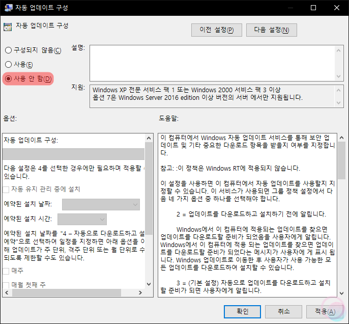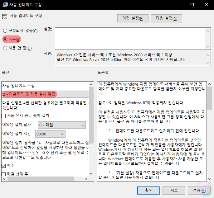 3) 구성되지 않음을 사용으로 바꿔준 뒤 다운로드와 설치를 미리 안내받고 싶으면 업데이트 구성을 2번으로 설정해주시고, 그냥 윈도우10 업데이트 자체를 비활성화 하고 싶을 경우에는 사용 안 함을 설정한 후 적용을 해주시면 됩니다.