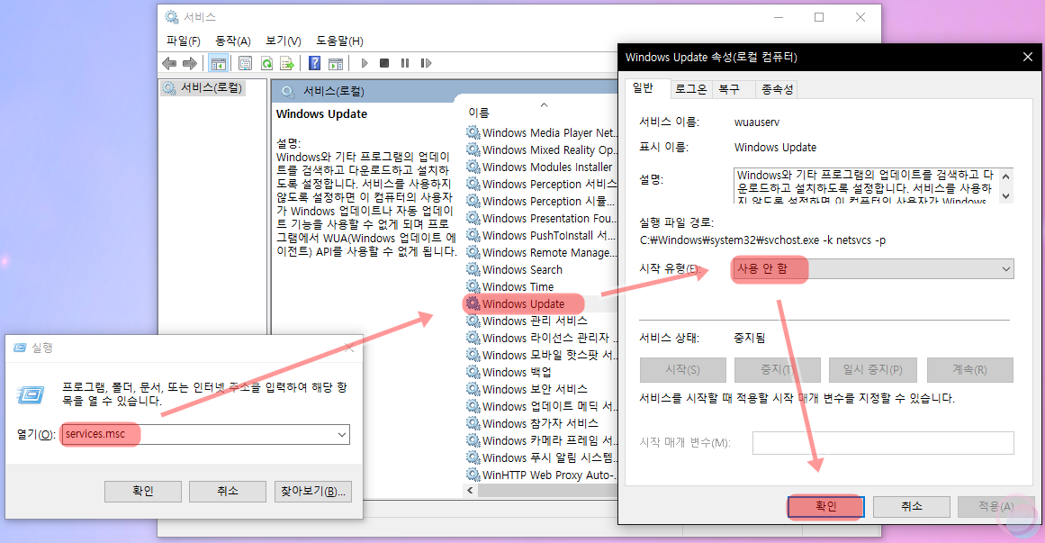 윈도우10 프로 이하의 버전에서는 로컬 그룹 정책 편집기에 접근할 수 없습니다. 이와 같은 문제가 발생하는 분들은 Win+R키를 누른 후 services.msc를 입력하여 서비스를 실행한 후 Windows Update를 더블클릭하여 시작 유형을 사용 안 함으로 체크해준 후 확인을 눌러주시면 됩니다.