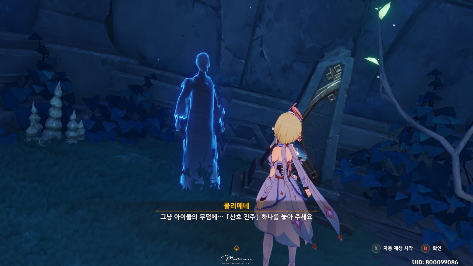 길을 따라 올라가서 클리메네에게 말을 걸면 태양의 자손들의 위령제를 진행하기 위해서는 가마의 고삐라는 아이템이 필요로 한다고 한다. 가마의 고삐 획득 방법은 상단의 포스팅을 참고하자.